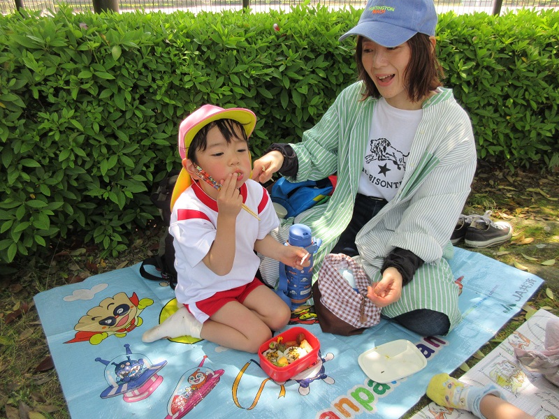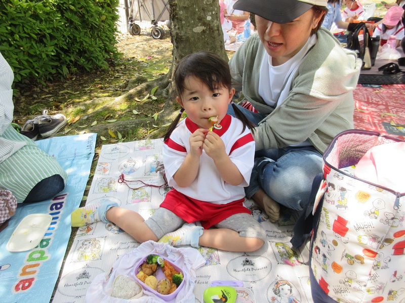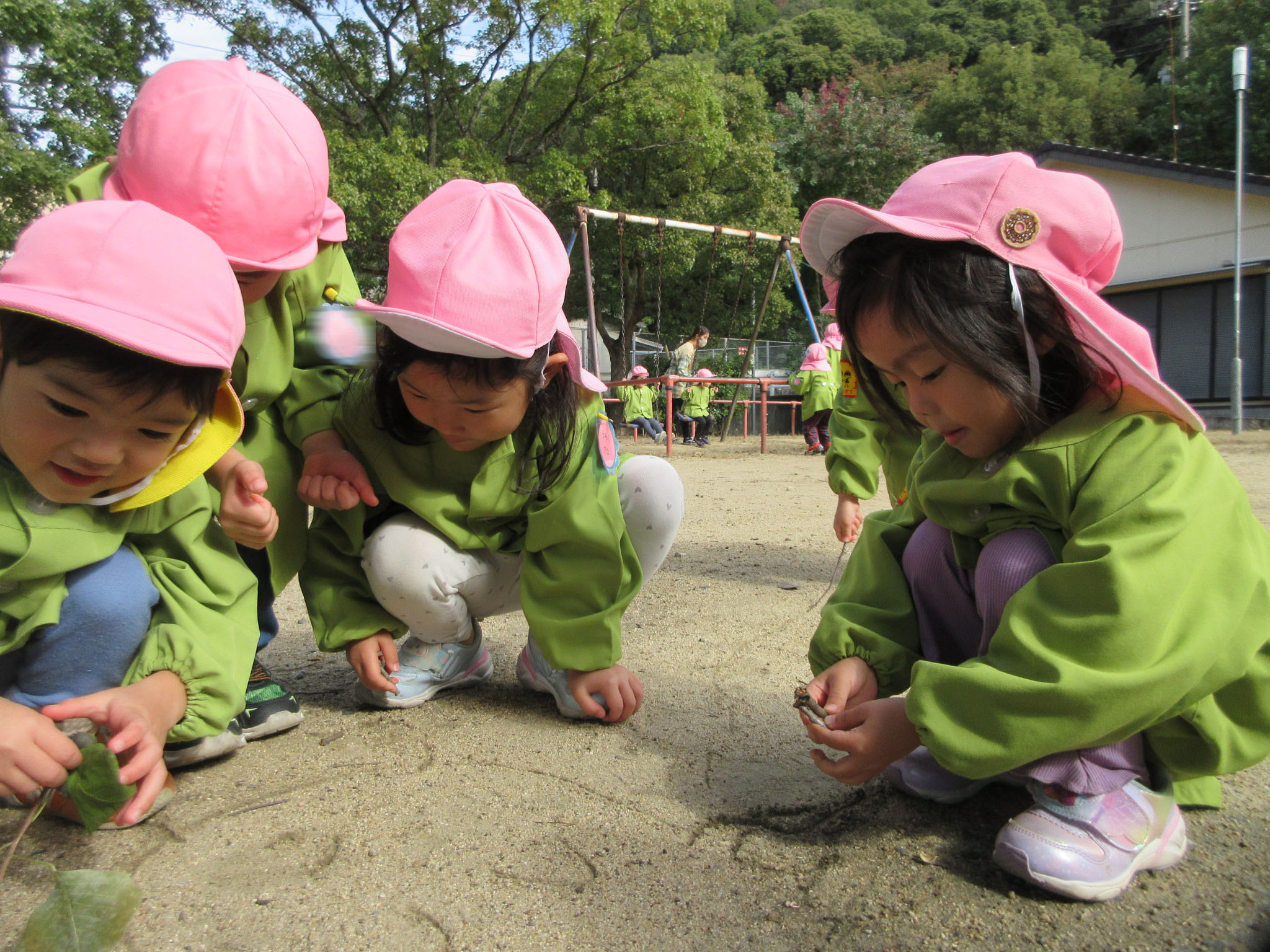 初めての八幡様までのお参りに「どこにあるの?」「近くにある!?」とワクワクなこどもたち! きりん組・らいおん組と一緒に八幡神社まで行ってきました。 到着すると「ここか!!」と驚いていました。「大きくなりますように」と目をつむって思いを込めていました。 舟入公園に行く途中にどんぐりを発見!みんなのポケットに入っているビニール袋に入れました。「めっちゃ大きい!」「これ赤ちゃんみたいに小さい」と大きさや色のくらべっこをしていました。 舟入公園についてみんなが楽しみにしていたお弁当タイム♪ 「みてみて!いいでしょ♪」「おいしい~」「お腹いっぱい」と嬉しそうに食べて大満足でした。 最後にボール回しゲームをしました。きりん組の速さにくぎ付けな子どもたち。だんだんゆっくりになりながらまわしていました(笑) 保護者のみなさま、愛情たっぷりなお弁当、様々な準備物登園時間等ご理解・ご協力いただきありがとうございました。「楽しかった~!!」「また行きたいね」とこどもたちにとってステキな思い出ができました(#^^#) |