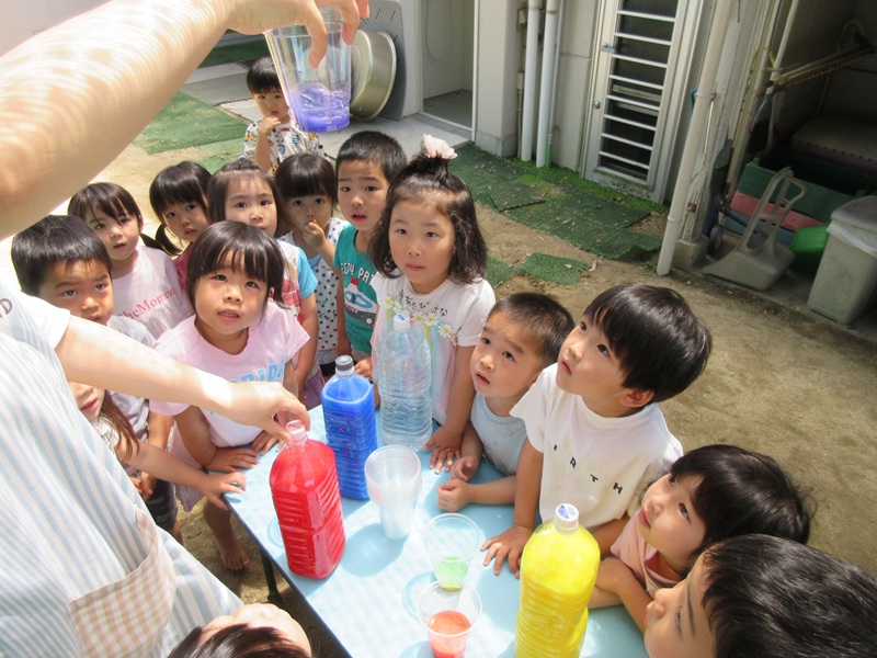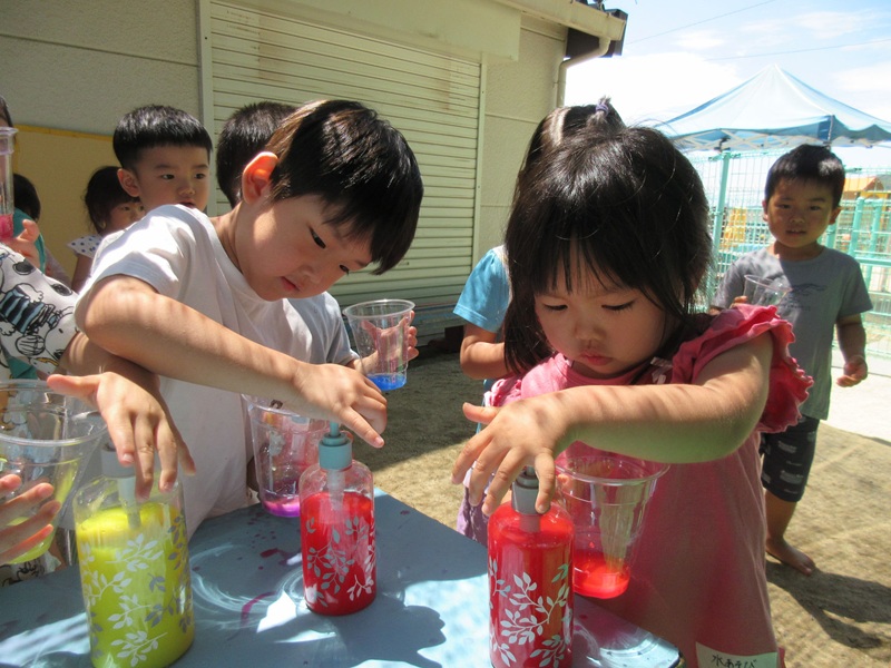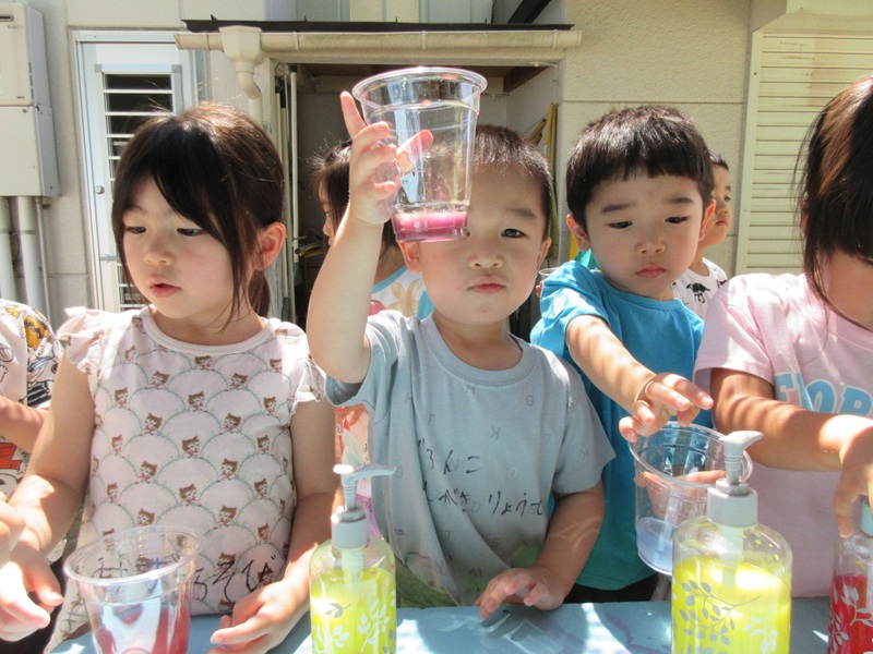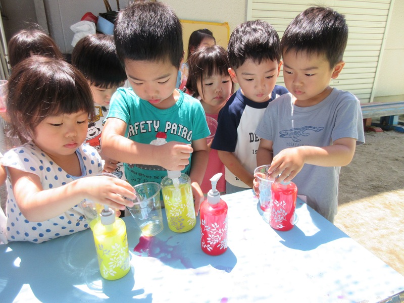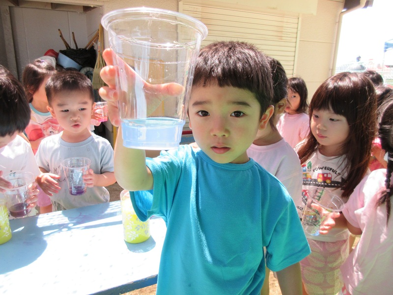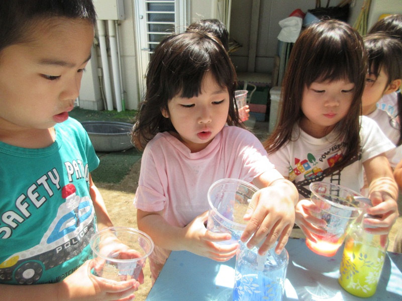 今日はぞう組さんでは初めての水あそびとして、『色水あそび』を しましたよ!! 水遊びが出来ると、ぞう組さんは朝からテンションが高め!! 頑張って自分で水着を着て、その上から準備して頂いた 水遊びセットを来ましたよ。着なれない水着に悪戦苦闘の ぞう組さん。先生に手伝ってもらいながら頑張って着ましたよ。 今日は寒天遊びの予定でしたが変更して色水あそびをしました。 水で溶いた絵の具の赤・黄色・青・お水を使って色水あそびを しました。 最初に赤と黄色を混ぜるとどうなるか、青と赤を混ぜるとどうなるか 青と黄色を混ぜるとどうなるかを観察しました。色が混ざり変化 していくことに「すごーい!!」「色、変わった!!」と 興味津々のぞう組さん。コップを持って思い思いに赤や黄色・ 青・お水を混ぜて色の変化を楽しみましたよ。 色水あそびをとっても楽しんでくれたぞう組さんでしたよ(#^.^#) |