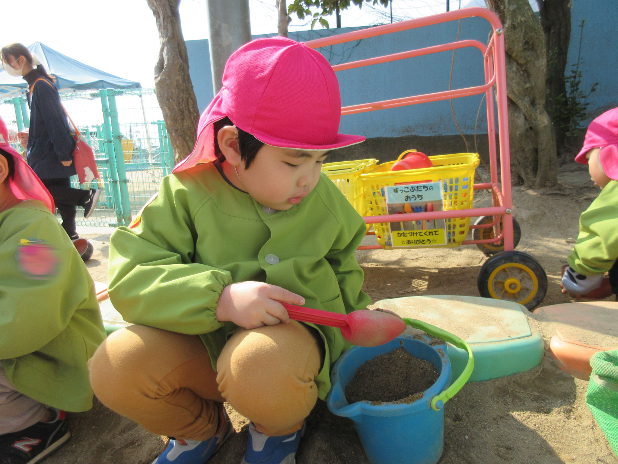 発表会の練習が始まり、「ネズミ役・おばあさん役・おじいさん役♪」と張り切っています。きびしい寒さになってきていますが、寒さに負けず元気いっぱいな子どもたちです♪ 今日は、みんなのリクエストで「砂場」で遊びました。 キッチンではオーブンを使って「30分温めます!(^^)/」とじっくりとご飯を温めてみたり、お皿を「ゴシゴシ~♪」と皿洗いをしたりしていました。 イスに座ってランチ会も開かれていました。 「これ食べる人~!!」「めっちゃ熱いよ!」と出来立てを並べていました。 友だちと協力をして砂場に穴を一生懸命作ってみたり、型抜きや砂きり等道具を色々使って遊んでいました( *´艸`) |