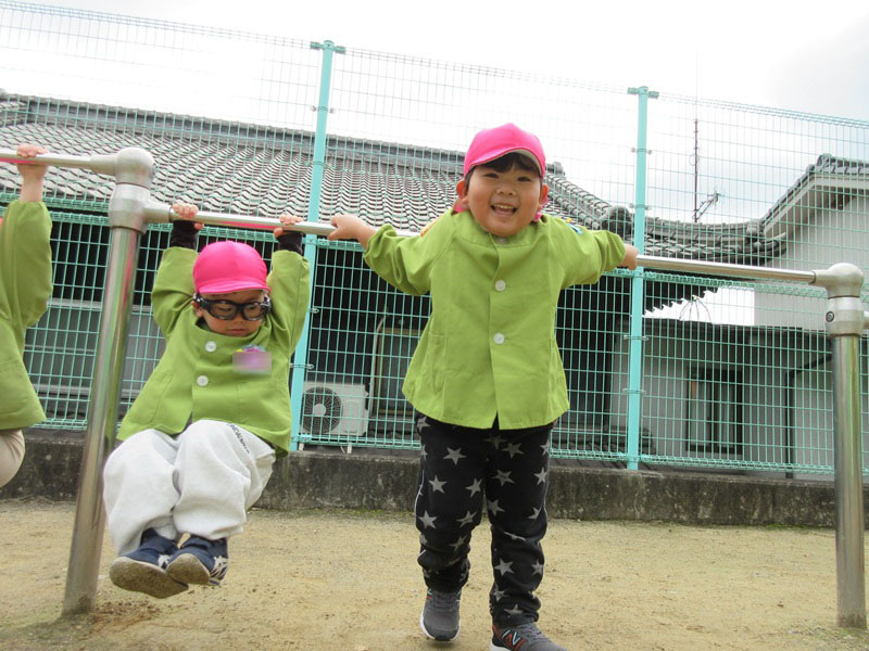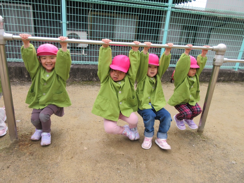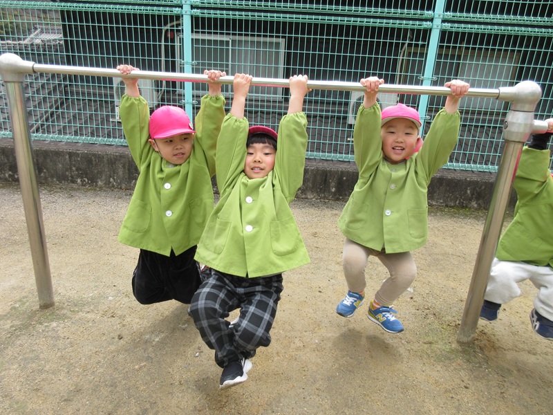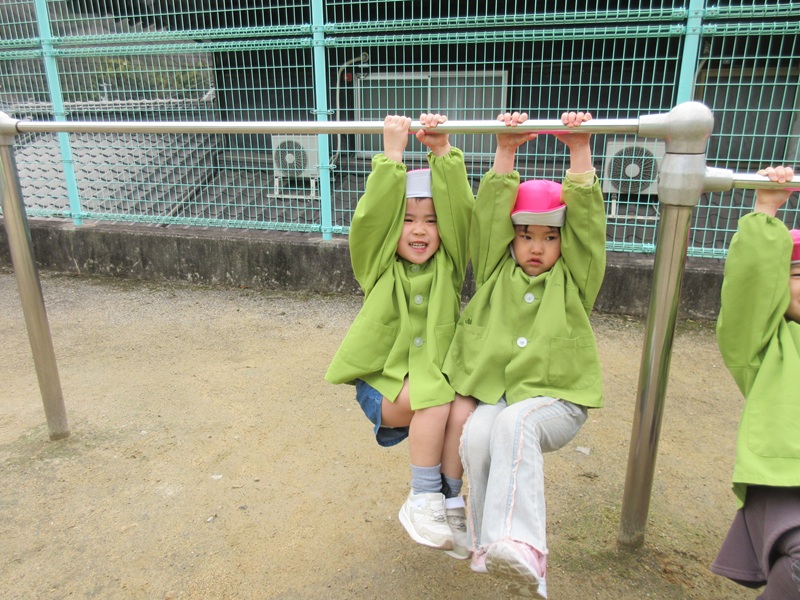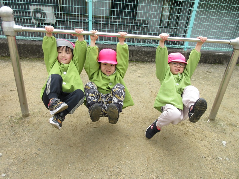 ぞう組で過ごすのも1ヵ月をきりましたね… 進級にむけて期待と不安がまざっているような子どもたちです。残りも元気いっぱい楽しんで過ごしていきたいと思います! 今日は、休み明けから楽しみにしてくれていた鉄棒をしました。 「今日は、晴れているから行けるね!!」「やっとできるのか」「早くしたい~」とワクワクしていました。 鉄棒のある場所につくと「ここか!!」「前から知ってたよ」と驚きと嬉しさにあふれていました。 順番にしてみるとぶら下がってみたり、どうやってしようと持ち方を何度も変えて試行錯誤をしていたりしていました。「手の力がめっちゃいるな…」と自分の手の平をみつめているお友だちもいました!(^^)! |