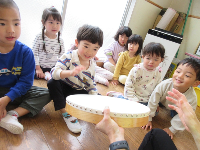 今日はぞう組さんが楽しみにしていたリトミックが ありましたよ!! 「リトミックってなにするのかな~」ととっても楽しみに していました。 始めに座ったまま「チューリップ」の歌に合わせて手を 揺らしましたよ。知っている歌だったのでみんなノリノリ♫ その後、リトミックの先生が持ってきていたハンドドラムを 触らしてもらいました。 タンブリンより大きくて見た目はタンブリンに似ています。 初めてのハンドドラムにみんな興味深々!! 優しく触ったり、手のひらで叩いたりしましたよ。 その後は立って「チューリップ」の歌に合わせて大きく 身体や腕を揺らしたり、しゃがんで小さく揺れたりしましたよ。 次にお部屋の中をピアノのリズムに合わせて歩いたり、 走ったり、ゆっくり歩いたり。みんなピアノの音を聴いて 上手にできていましたよ。他にもボールを持ったまま歩き、 転がっていくピアノの音でボールを転がしたり、薄い布を 使って「ひらいたひらいた」の曲に合わせて布を揺らし て楽しみましたよ。 リトミックの時間の間とっても楽しそうなぞう組さんでしたよ。 お家でも聞いてみてくださいね。 |