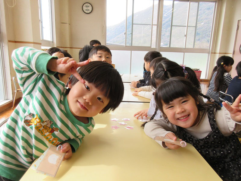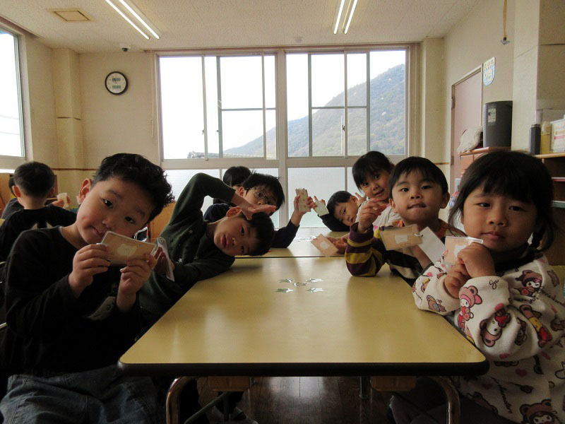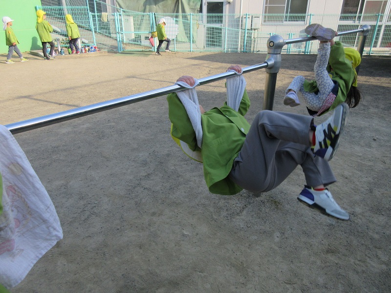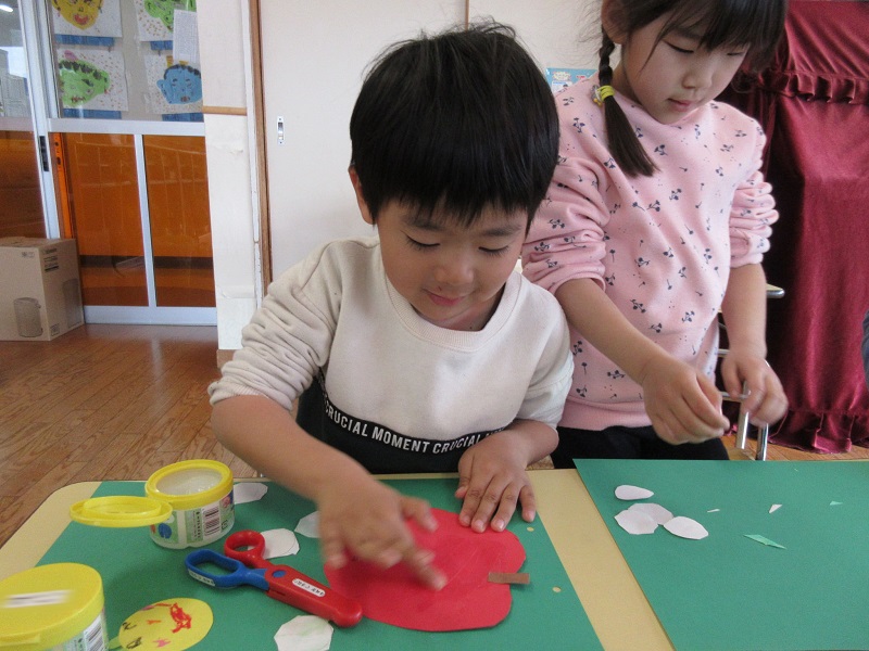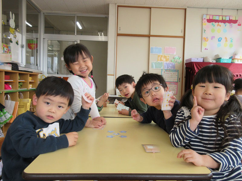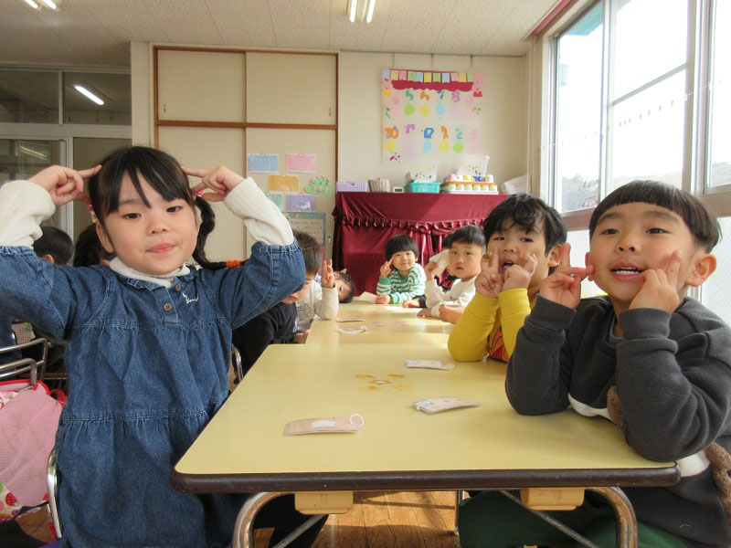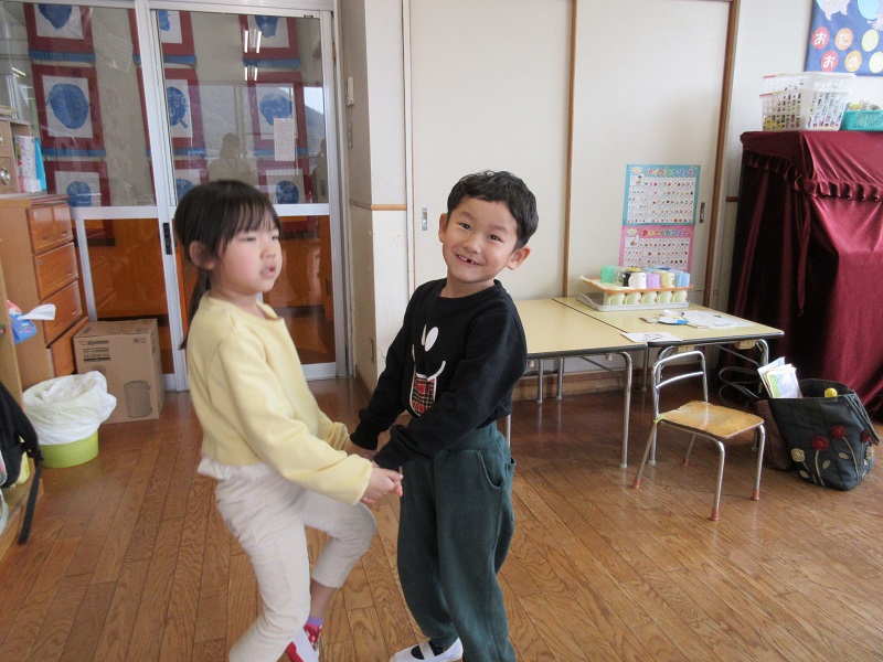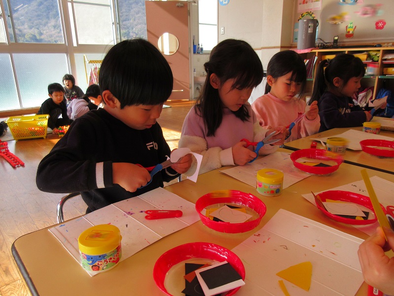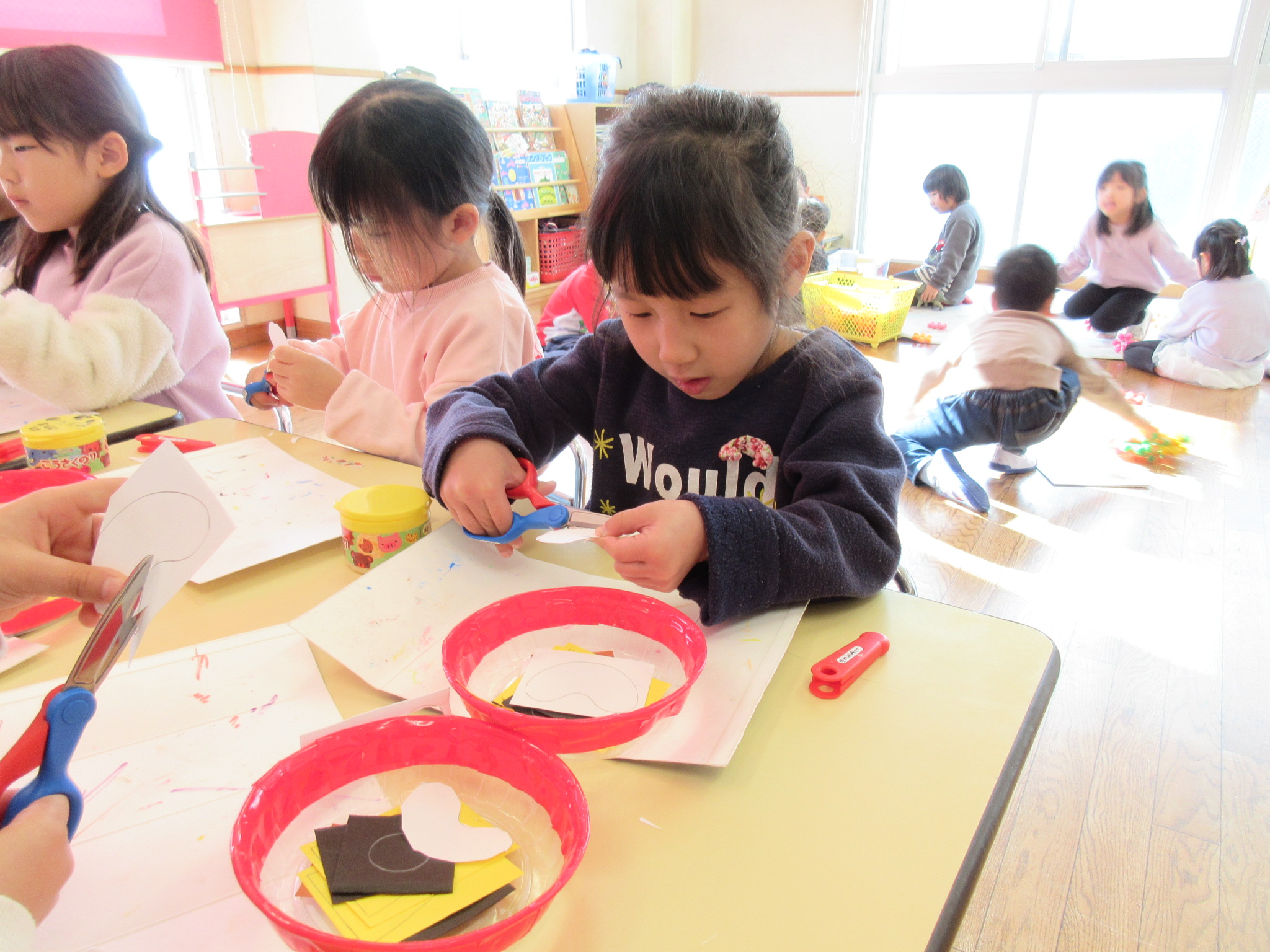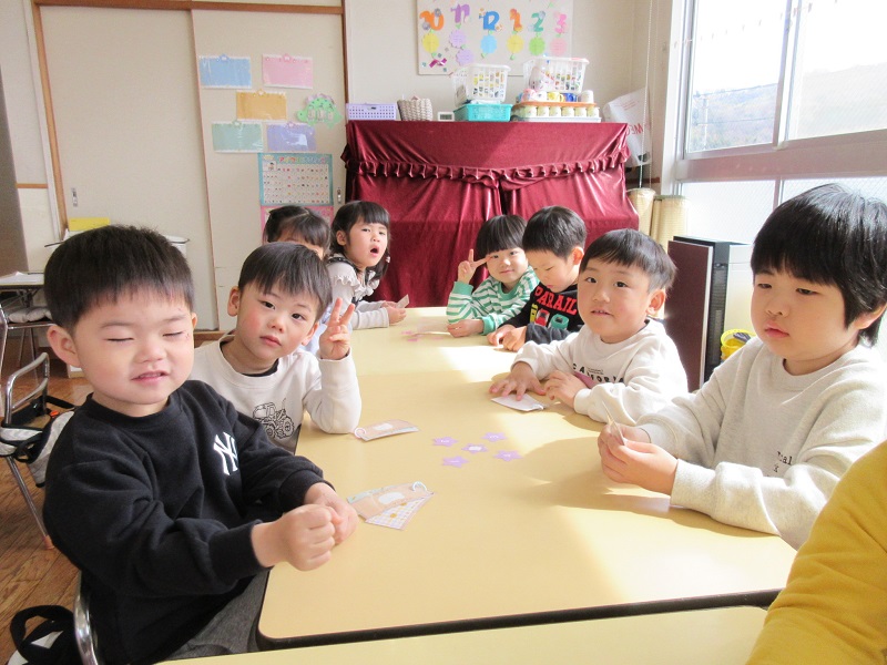 はやいものであと2ヶ月できりん組さんが終わりますね。 発表会では大成長した姿を見てもらえたかと思います!最近のきりん組さんは来週の節分が楽しみで仕方がないようです(*^▽^*) 「鬼何人くるんかな~?」「あの山から下りてくるんだって~!」と大はしゃぎですよ! そんな節分に向けて鬼のお面を作りました!はさみを上手に使えるようになってきたので鬼の顔のパーツはすべて子どもたちに切ってもらいました!丸や直線だけでなく、少し複雑な形も難なく切っていました☆作ったお面をかぶって鬼退治をするのが楽しみですね! 月曜日は英語のレッスンもありました!少しづつ分かる単語が増えてきて英語のレッスンが楽しいようです!身体を動かすことが好きなのでお友だちとペアになってふれあい遊びをする時が1番楽しそうですよ♪ 外遊びでは鉄棒や渡り棒に興味を持っています!「らいおん組さんになったら前回りと逆上がりせんといけんけ~練習しとこ~!」と練習を始めていました!逆上がりは身体を引き付けることが難しいようなので、タオルで背中を支えて身体を持ち上げる練習をしています!「できた~!」と嬉しそうでした♡ |