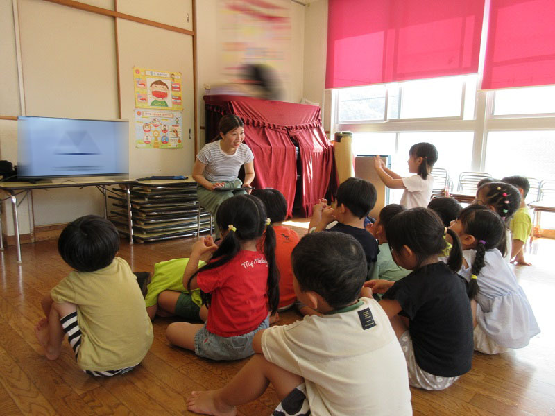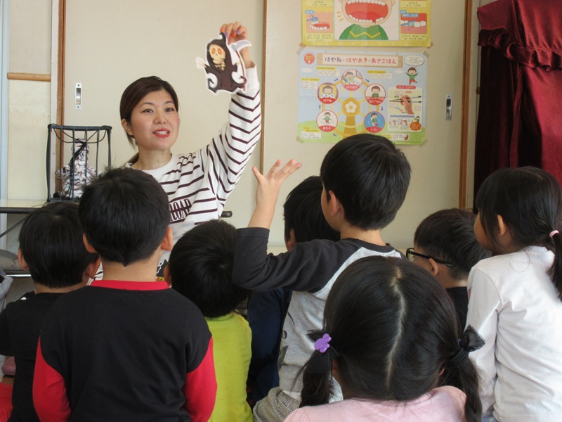 今日は英語のレッスンの日! ハロウィンが近いのでお化けやジャックオランタン、モンスターたちが遊びに来てくれましたよ(*^-^*) まずはお化けの家族の名前を英語で言いました。 mother ghost・father ghostと呼んでいきましたよ! お化けが出てくるたびに「わ~!」と喜んでいた子どもたちです( *´艸`) 次はお腹のすいたジャックオランタンが出てくるお話を見ました! 冷蔵庫の中からサクランボを出して食べるとなんと赤色のジャックオランタンになりました! ぶどうを食べると紫に、トウモロコシを食べると黄色になり、最後にオレンジを食べると元の色に戻りました。 色の名前も先生と一緒に発音しましたよ☆ だんだんと英語が上手になってきているきりん組さん! 参観日は英語のレッスンです!楽しみにしていてくださいね(^^)/ |