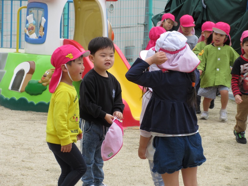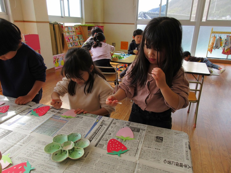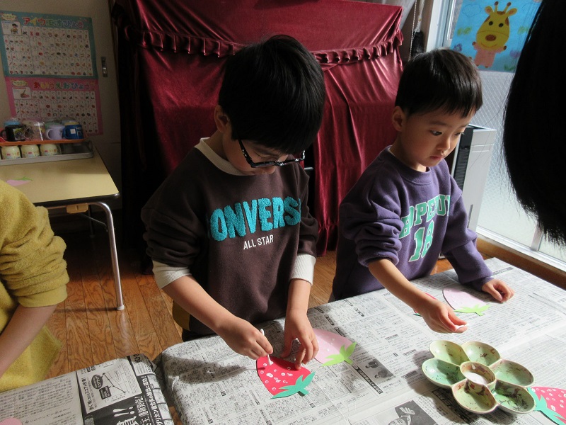 3月に入り、暖かい日もあり、少しづつ過ごしやすい気温になってきましたね! 今日は春の壁面を作りました!春といえばイチゴ!動物たちがいちご狩りをしている壁面にする予定なのできりん組のみんなにイチゴを作ってもらいました♪ピンクと赤色のイチゴに絵の具をつけた綿棒でスタンプをしました!とっても可愛いイチゴができたので飾るのが楽しみですね! 製作の後は今ブームのハンカチ落としをしました!今週は雨の日が続いていたのでお部屋でもできるハンカチ落としをしてみると楽しかったようで「次はいつするん!?」と楽しみにしていました!簡単なルールなのですぐに覚えていました!お部屋なので早歩きという制限はありますが、いつハンカチが落とされるのかドキドキな子どもたちでした! 最後は外遊び!今週は外に出て遊べていなかったので久しぶりの外遊びがとっても楽しそうでした!ぱんだ組さんが参観日でアンパンマンの運動場で遊んでおり、鉄棒や渡り棒をいろんな方に見てもらい、褒めてもらって大満足の子どもたちでした( *´艸`) |