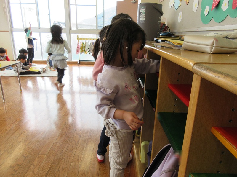 もうすぐきりん組さんが終わりますね。長いようで短い1年間でした! きりん組では初めての英語のレッスン・日本太鼓・鍵盤ハーモニカがありましたね!どんなことをするんだろ~とワクワクドキドキしていた子どもたちが懐かしいです( *´艸`)何事にも集中して頑張って取り組んでくれていました☆ 友だちとの関わりがさらに増え、時にはお友だちと気持ちがぶつかってしまうこともありましたが、自分たちで話し合うことができるようになり、気持ちの折り合いがつけられるようにもなりました! 最近では自分で出来ることは自分でする練習をしています!かばんを自分で持ったり、おしぼりをしぼったりとできる事がとても増えています! きりん組さんはらいおん組になることを心待ちにしています!次のきりん組さんが気持ちよくお部屋を使えるようにみんなでロッカーをキレイにしました!「隅っこまできれいにしよ~!」と意気込んで今いたよ☆ いよいよらいおん組さんが始まります!最終学年、たくさん成長してたくさん思い出を作ってね♡ |