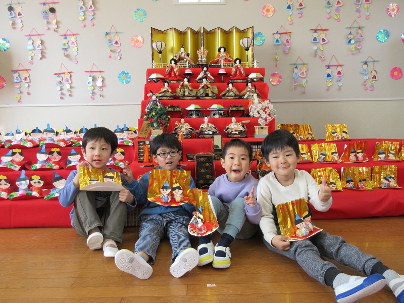 明日で2月も終わり、きりん組さんで過ごすのもあと1ヶ月になりましたね。1人で出来ることも増え、らいおん組さんに向けて頑張っている子どもたちです! 今日は3月の壁面製作を完成させました!3月はあおむしとリンゴを作りました!リンゴは自分たちではさみで形を切って貼りました。あおむしは体の部分はアルミホイルに水性ペンでなぐり描きをして、霧吹きでにじませて画用紙に転写しました!2色使ったので色が混ざってきれいな色になっていました☆緑色の画用紙に、リンゴとあおむしを貼ったら完成!「僕はまっすぐなあおむしにしよ~」「私はくねくねしたあおむしにしたよ~!」といろんな動きのあおむしができあがりました♡ 製作の後は作ったひな飾りをもっておひな様の前で写真撮影!来週のひなまつり会を楽しみにしているようです(^^)/ |