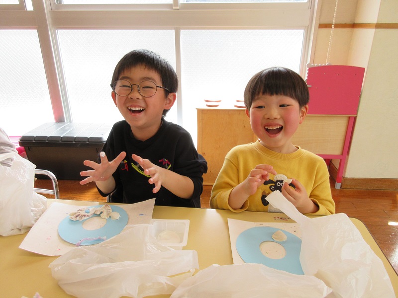 あけましておめでとうございます!2025年が始まりましたね! 休みが明けて一週間、やっと元の生活に体が慣れてきて発表会の練習も頑張っていますよ☆ 今週は凧あげを作りました!今年はへび年!ということでへびの形をしたクルクル回る凧を作りましたよ。製作の前に少しやって見せると、「おー!すごー!めっちゃ回るじゃん!」と興味津々でした(*^▽^*)はさみの使い方にも慣れてきて、初めてクラス全員ではさみを使ってみました。慎重に切っていき、うずまきの線の上を上手に切ることが出来ていましたよ! 作った凧は運動場で遊んでみました!今日はたくさん風が吹いていたのでクルクルといっぱい回っていました!思う存分遊んだ後はお友だちと鬼ごっこをして身体を温めていました♬ |