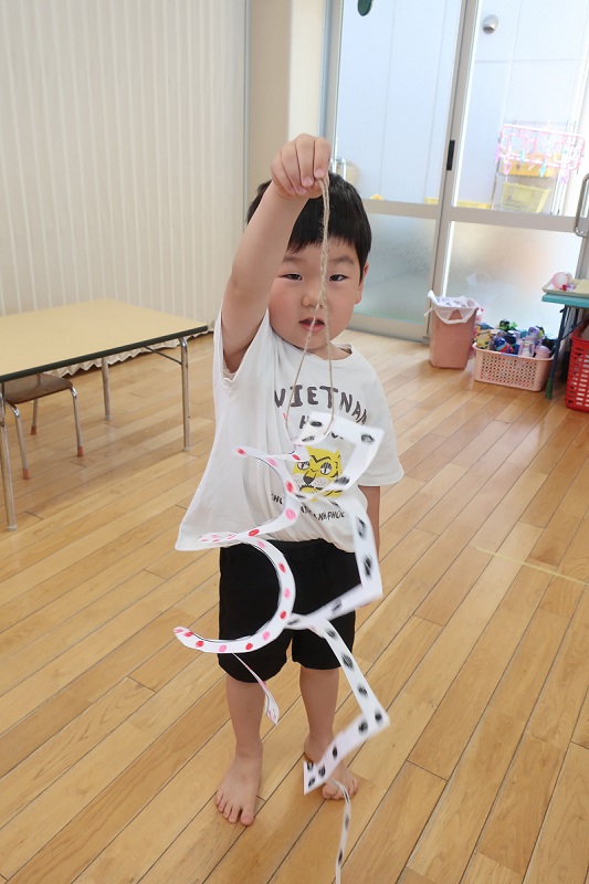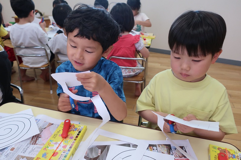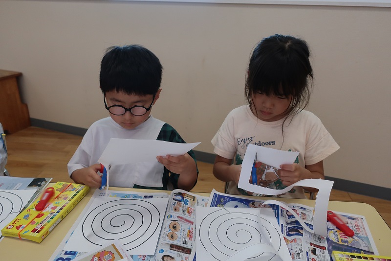 今日の絵画教室では、渦巻き凧を作りました! 渦巻きになっている四角と丸を途中で切れないように、そーとハサミで切って、長いへびのような凧を作りましたよ(*^^*) 最初にはさみの刃先を人に向けない、刃の方は手で持たない、人に渡すときは、刃先をもって渡すなどのハサミを使うときのお約束を教えてもらってから、安全に製作できるように心がけました(*´▽`*) 渦巻きがきれることのないように、そーと切る人や、迷いなく切っていく人や色々な切り方のお友だちがいました♪ 切れた後は、風になびいたときにきれいに見えるようにクレヨンで模様を描きました! へびに見立てて、柄をつけたり、虹色の凧を作ったりと思い思いに可愛くしました(*^^*) 絵画教室は終わった後に、外に遊びに行き、タコで遊びたい人は凧をもって外で遊びました! 風になびくと、模様がキラキラとしてとてもきれいでしたよ(*´▽`*) |