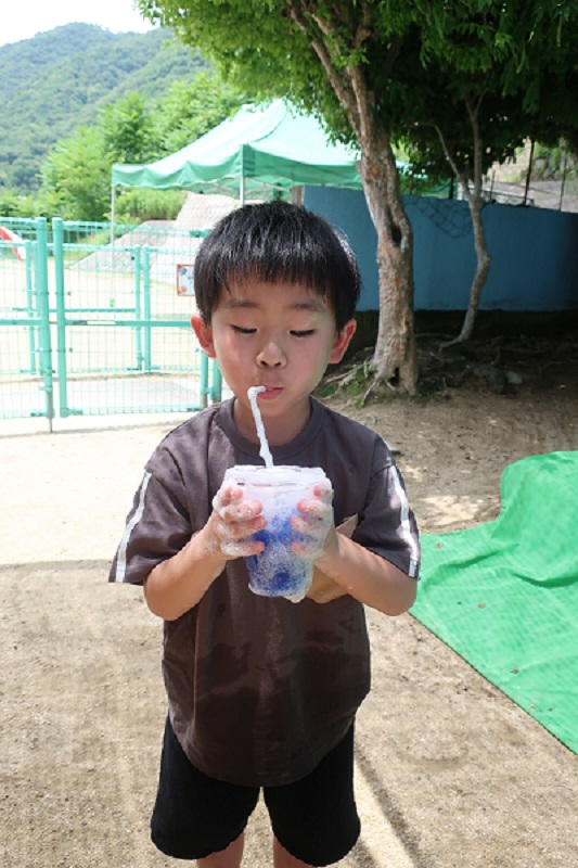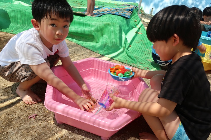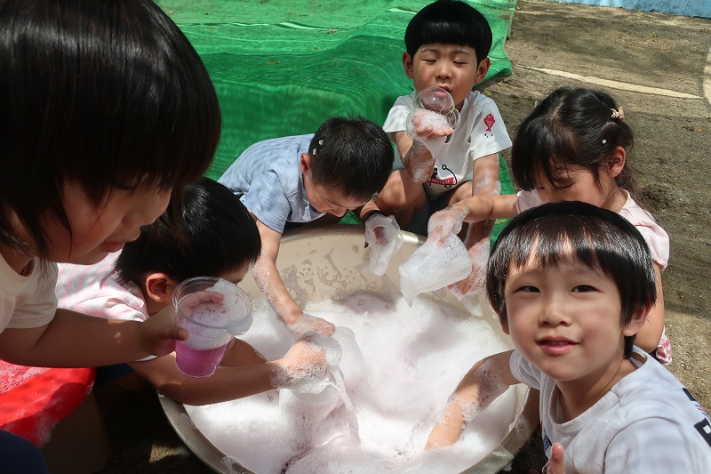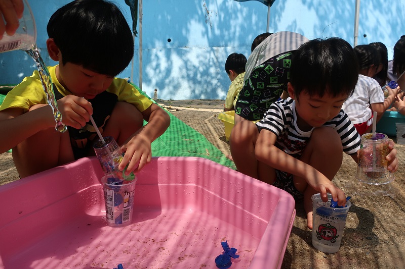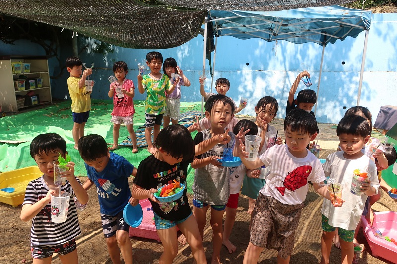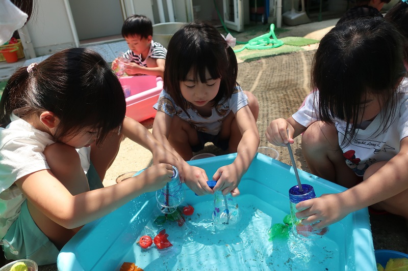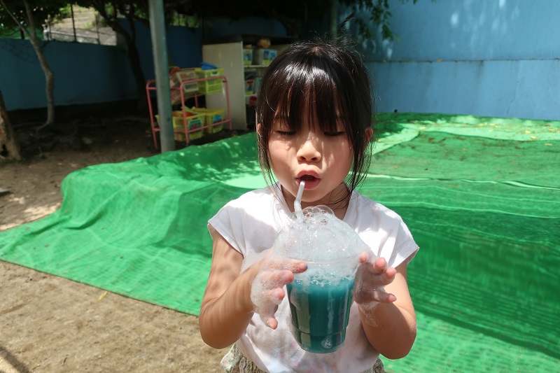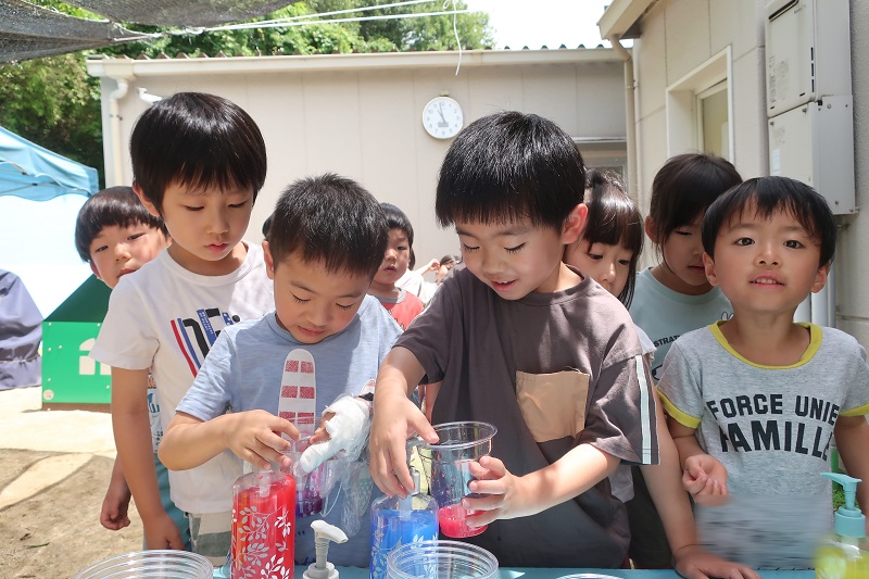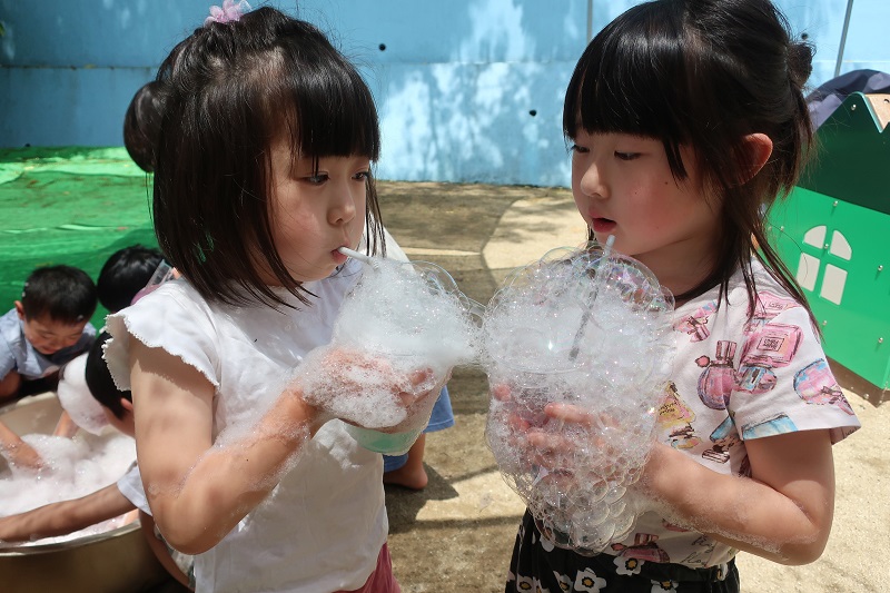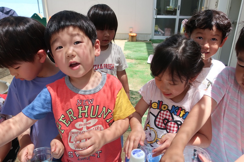 今日から水あそびが始まりました♪ 今日は色水と泡を使って色水あそび&泡遊びをしました! 赤、青、黄色の色水、透明なプラコップ、洗剤を用意して、 まずは好きな色の色水をコップの中に入れます! 洗剤をすこしだけたらして・・ 上からお水をそそぐと、泡が立って炭酸のジュースみたいに! 色を組み合わせて緑色を作り、「メロンソーダができた!」と新たな色でちがうジュースを作ってみたり、 吸い込まないように気をつけながらストローで泡をぶくぶくと膨らませ、「ビールみたい♪」と楽しんだり、 「砂を入れてタピオカジュースつくるんだ~!」と先生も驚かされる発想が!! 最後はたらいに入れて、たくさん泡を作り、身体全体で泡遊びを楽しみました♪ これから目や手、身体全体を使って夏ならではの感触遊びをたくさん楽しんでいきたいと思います(*´▽`*) |