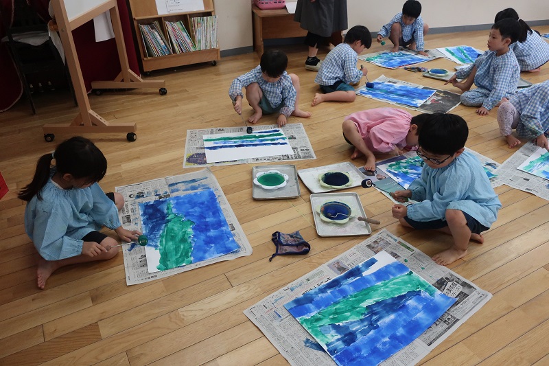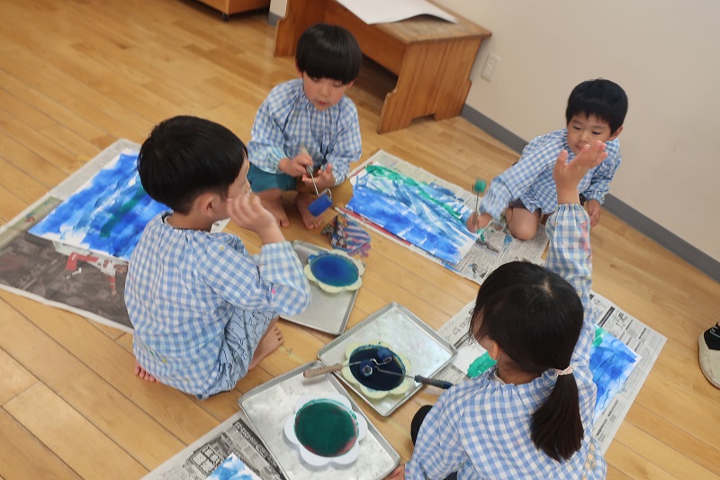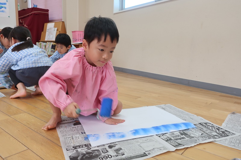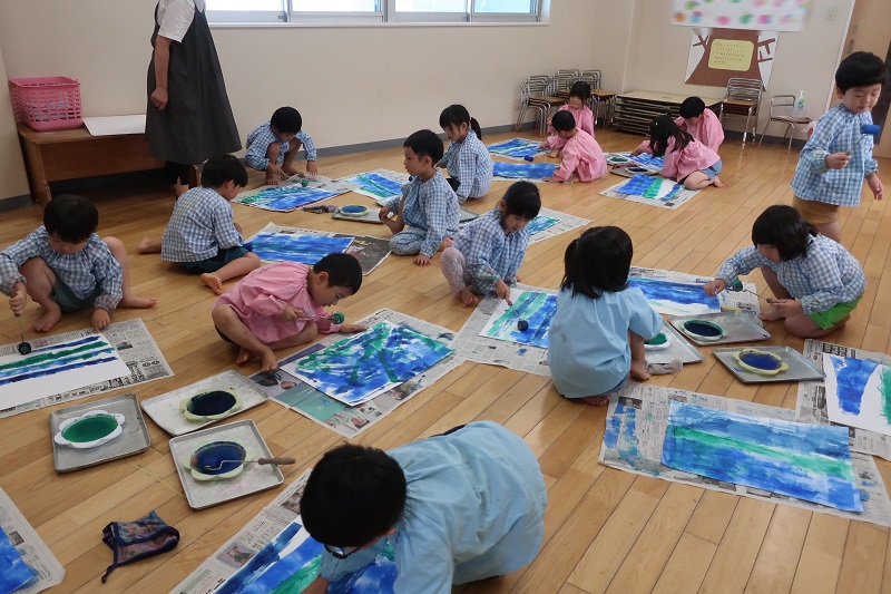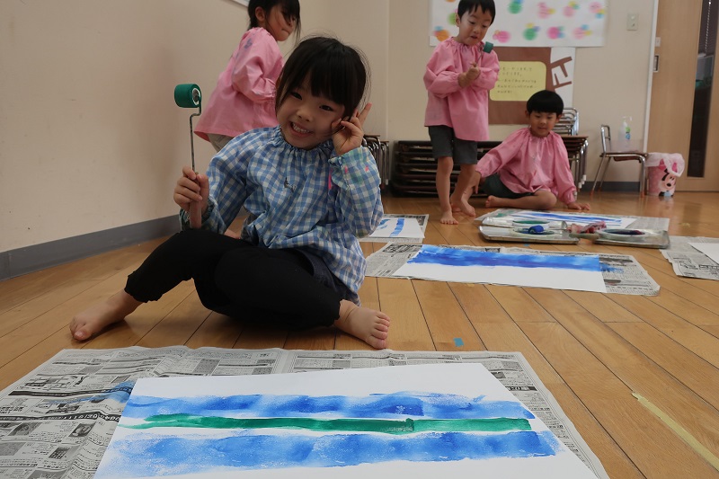 今日は今月一回目の絵画教室がありました! 今月の絵画は海の中テーマです♪ 一回目の今日は、ローラーと絵の具を使って画用紙に海を表現しましたよ! 青、緑、藍色の絵の具を使って、色を重ね合わせ、波を表現したり、グラデーションにして海の深さを表現しているお友だちもいました(*^^*) ローラーで海を描いた後は、シャボン液と白色の絵の具を使って、海の中の泡を表現しました! しゃぼん玉をぷーと膨らませたあとに弾けると、白色の点々がたくさんでき、泡のように! 『すごい!』『お顔に着いちゃったよ~』と楽しそうに製作するらいおん組さん(*^^*) 顔に着いた絵の具も楽しんだ証拠ですね♪ 次回の絵画は、海の中に魚や貝などの海の生き物を描いていきます! 今日完成した素敵な海にどんな生き物を描こうかな? 次回もとっても楽しみだね♪ |