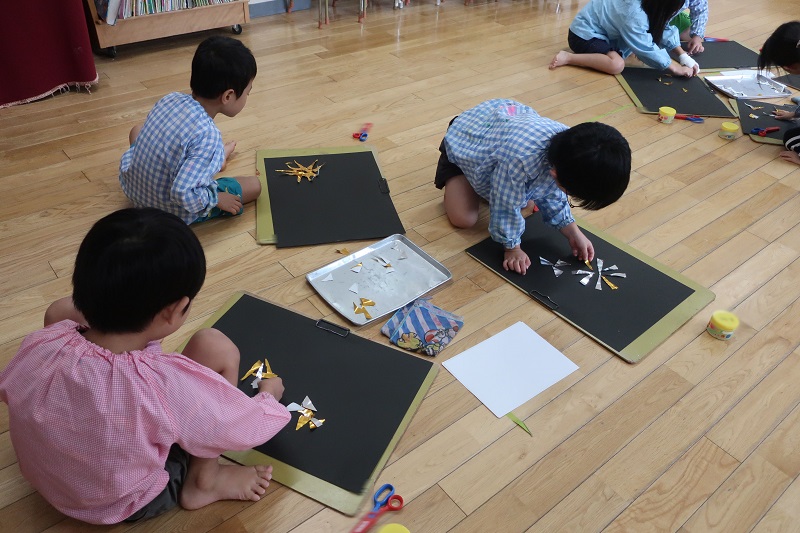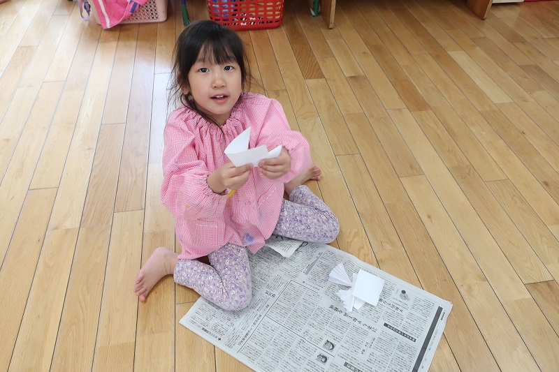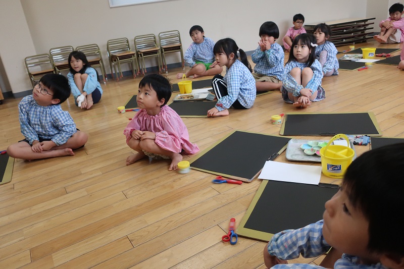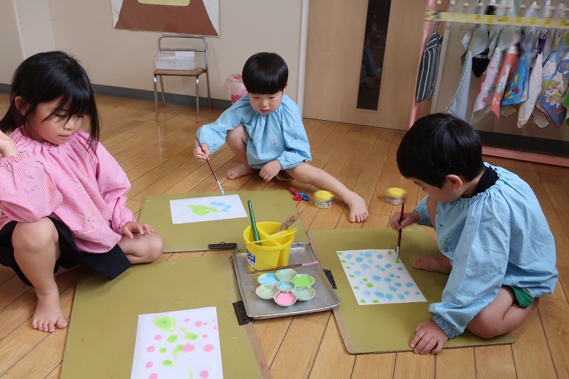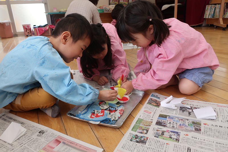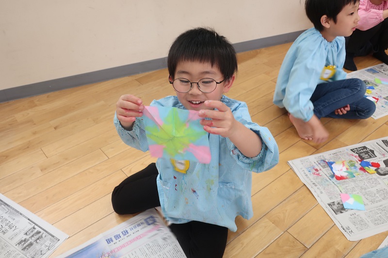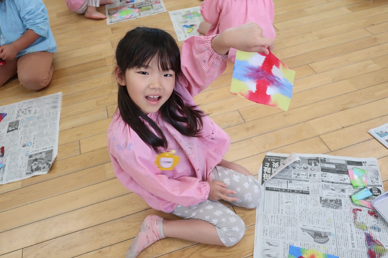 今日は5月に入り、初めての絵画教室はがありました! 今回の製作は和紙と絵の具をつかった染め紙です♪ 和紙を三角、四角、じゃばら折りに折って、赤、青、黄、ピンク、水色、黄緑色の絵の具に角をつけて染めていきます! どんどん絵の具が染み込んでいく様子を楽しみにながら製作するらいおん組さん(*^^*) 最後は、自分の好きな形に折って染めてみましたよ! 『どの形に折って染めた和紙の模様がお気に入りかな~?』 という先生の質問に、自由に折って染めた和紙が一番好き~!というらいおん組さんが多かったです!! 次回は今回染めた和紙を使って花火を製作する予定です! 次回が楽しみだね♪ |