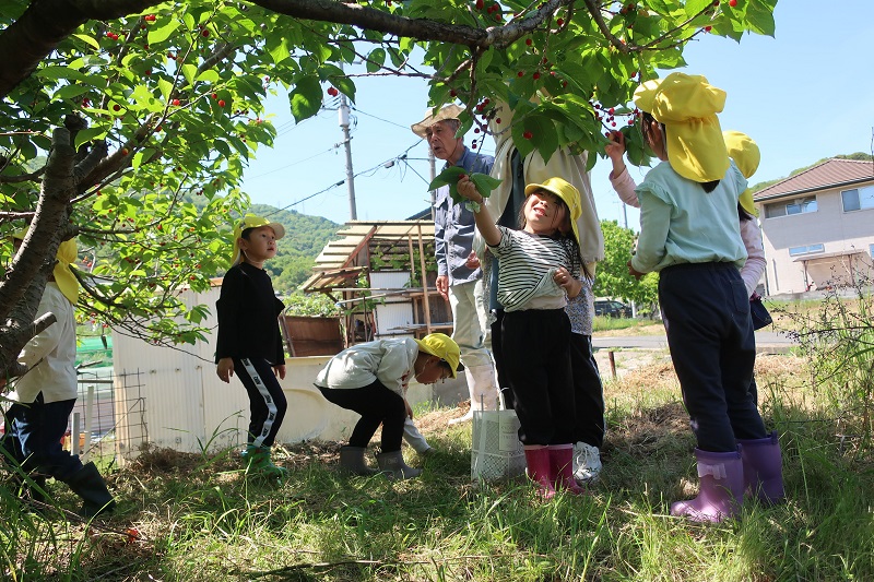 今日は給食を食べたあとに、地域の『縄稚のおじちゃん』にお招きしてもらってさくらんぼ狩りにいってきました! 昨日からさくらんぼ狩りを楽しみにしていたみんな! 最初にご挨拶をして・・ 早速さくらんぼのある畑にレッツゴー! おじちゃんとお話をしながら楽しくお散歩をしましたよ(*^^*) 頑張って歩いて着いた先には。。 たくさんのさくらんぼがなった大きな木が! みんな『うわー!さくらんぼがいっぱいだ!』とさくらんぼをたくさん見つけて興奮が収まらないようでした(*^^*) 『赤いの見つけた!』『見て!4つつながってるよ!』といろんなさくらんぼを見つけて袋がいっぱいになるまで収穫してくれました(*´▽`*) 少しだけその場でさくらんぼを頂いて、残りは園に持ち帰り、みんなで分けました♪ お家で食べるのが楽しみだね! 切り落とした大きなさくらんぼの木もおじちゃんが『もって帰っていいよ~』と園まで運んでくれました(^^♪ 最後に『ありがとうございました!』としっかりご挨拶をして園に帰りました(*´▽`*) |