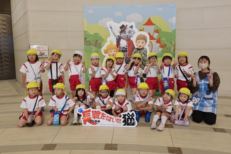 今日は待ちに待った人形劇を見に行く日!! お話のCDを聞きながら、いまかいまかと待っていたらいおん組さん♪ 今回見に行ったのは『長靴をはいたねこ』というお話です! 突然話し始め、2足歩行で歩き始めた「エスプリ」という猫。エスプリはスリアンという一緒に暮らしていた男の子と一緒に幸運探しのたびに出かけます♪王国の王様やお姫様を巻き込んで、エスプリとスリアンはどんな幸せを見つけるのでしょうか?というお話です! 歌を歌ったり、ダンスを踊ったり、通路までエスプリやスリアンが来てくれたりと盛りだくさんな内容でした!! 見ている子どもたちもダンスに合わせて少し身体を揺らしたり、手拍子で盛り上げたりして、終始キラキラした目で見入っていましたよ! 劇が終わった後は、「もう終わり~?」「次はいつ見れるの?」とはやくも次回を期待するらいおん組さんでした(*´▽`*) あいにくの雨でしたが、傘を差しみんなで歩いたのもいい思い出❀ また一つ楽しかった思い出が増えました(*^^*) |
