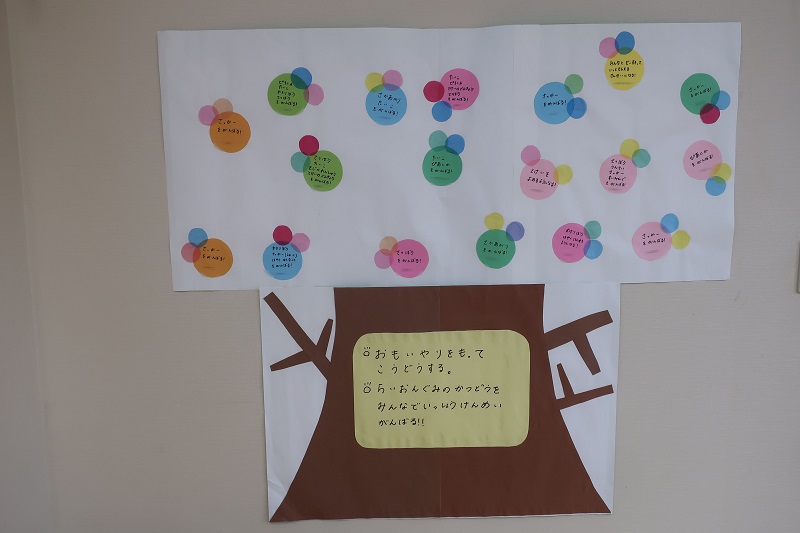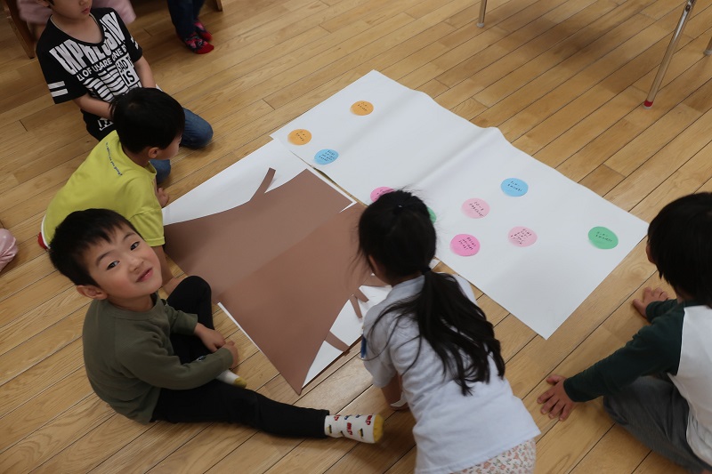 今日は、朝の会で4月にみんなで決めたらいおん組の目標と一人ひとりの目標を画用紙に貼り付け、ポスターを製作しました! 『鉄棒を頑張る!』『太鼓を頑張る!』『ひらがなを読めるようになる!』などそれぞれ頑張りたい目標を決めて、らいおん組が終わるまでの間に頑張ろうね!とお話しました(*^^*) らいおん組みんなの目標は、話し合ってみんなで決めた『思いやりを持って行動する』『らいおん組の活動をみんなで一生懸命に頑張る』です!! この目標のように、お友だちを思いやって、一生懸命頑張るらいおん組さんの姿が見られるのが楽しみです! ポスターを作って、目標が常に見えるようになり、今までよりももっと目標に向かって頑張ってくれるのではないかなと思います! 1月ずつ自分の目標達成できたか考え、できたと思ったら目標を描いた丸い画用紙の周りに花びらを貼って行ってもらいます(*^^*) らいおん組が終わり、卒園する頃には、満開の花が見られるといいな(*´▽`*) 目指せ!花咲くらいおん組♪ |