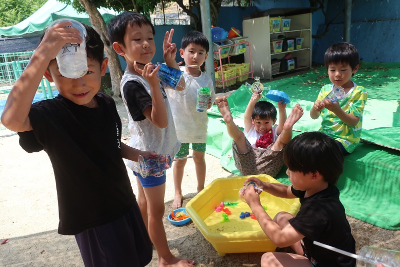 今日のらいおん組さんは、太鼓の練習を頑張った後に、水あそびをしました♪ 可愛い桶の中には、金魚がいっぱい♪ 『網でとるのー?』『バケツでとるのー?』と頭にはハテナがいっぱいのらいおん組さん! 先生が遊ぶ直前まで秘密にしていたものは・・ なんと水の中で使える『ユーホーキャッチャー!!』 以前みんなでお絵かきをしたプラコップの中にストローとプラコップを気って製作したユーホーキャッチャーのアームを取り付けました♪ 『えー!ユーホーキャッチャー!楽しそう(*^▽^*)』 とワクワクが隠しきれない子どもたち♡ 『いっぱいつれたよ!』『難しい~』とお友だちと話しながら楽しむらいおん組さんでした! 8月が始まり、まだまだ暑い日が続きます! みんなで作ったこの手作りユーホーキャッチャーで沢山夏を満喫しながら遊びたいと思います(*´▽`*) みんな楽しかったね♪ |