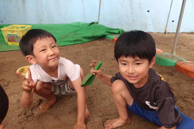 今日は和太鼓の練習をした後に、どろんこ遊びをしました! 朝から雨が降っていて、「大丈夫かな~どろんこ遊びできるかな」と心配そうにしている子や、「雨ふってるから、どろんこ遊びしやすいね!」とポジティブにとらえる子と様々な反応だったらいおん組さん♪ 和太鼓の活動をした後に、ちょうど雨がやみ、いいお天気の中でどろんこ遊びをすることができました! 最初に先生が少し砂にお水をかけ、泥水に・・ そこからは子どもたちで、たらいから水を運んで、みんなで川や山を作って遊びました! 「ここに川を作ろうよ~」「お水もっと必要だね!」協力しながらみんなで作ることを楽しんでいる様子にほほえましいとともに、成長を感じました(*^▽^*) 色々な行事や練習があり、日々頑張っているらいおん組さん! たくさん楽しいことをしつつ、年長さんならではのいろいろな活動をこれからも頑張って行こうね!! |