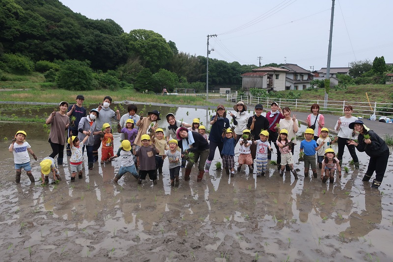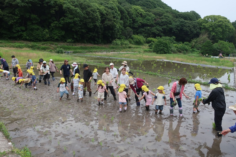 今日は、お昼から地域の方々に協力していただいて、田植えに行きました! 保護者の方と一緒にレッツゴー!! 散歩で見に行った田んぼに水がはってあり、すごーい!と興奮気味のらいおん組さん♪ サンダルを脱いで準備万端!! 地域の方のお話を聞きながら線の印に合わせて苗を植えていきました♪ 『足がはまっちゃうよ~』『動けない~』と言いながらも、しっかりと動いて田植えを頑張りました!! 園に帰るころには、田植えの泥で汚れてしまって服や靴下が頑張った証になりました(*^^*) ご参加いただいた保護者のみなさまお忙し中ありがとうございました! またらいおん組さんで素敵な思い出ができました☆彡 |