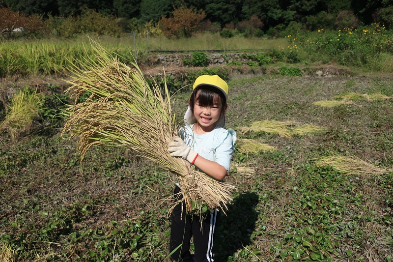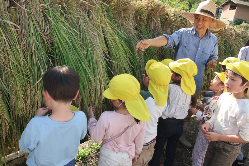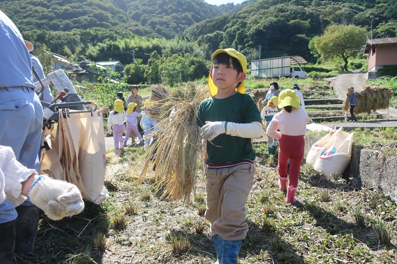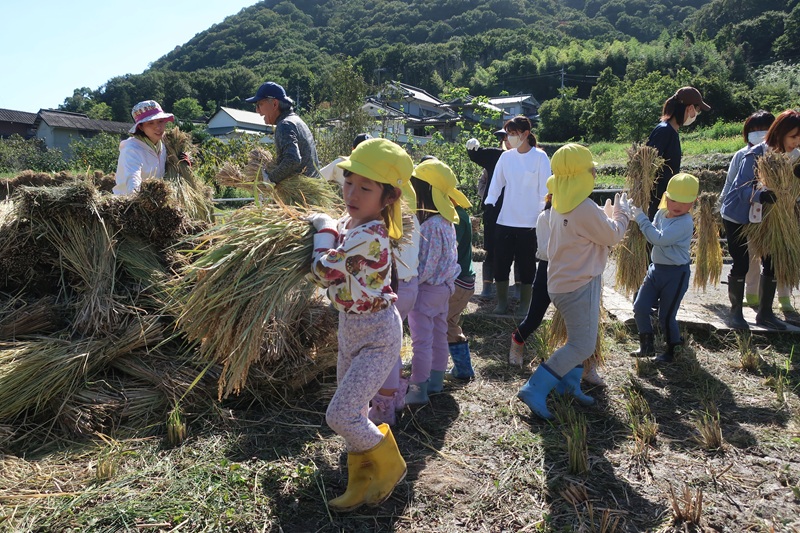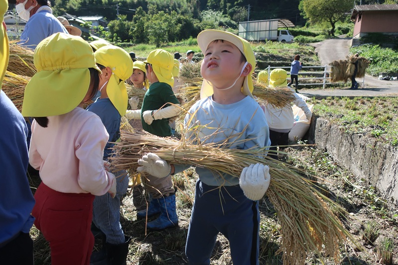 今日は午後から保護者の方と一緒に稲刈りにいきました! みんなで田植えをしてから4ヵ月たち、地域の方々のおかげで子どもたちの背と同じくらい大きな稲穂ができました(*^-^*) 地域の方々が稲を刈って束ねてくれていたので、らいおん組さんのお仕事は稲の束を干すところまで運ぶこと!保護者の方に干すのを手伝ってもらい、連携しながら頑張りました♪ まだまだ暑さが続く中、汗だくになる子どもたち・・水分補給をしたり、休憩をしたりしながら、取り組みましたが、休憩するのも一瞬で「もう休憩したー!みんな頑張るぞ~!」とやる気満々で活動してくれました(*´▽`*) 大きく重たい稲を「よいしょよいしょ」と一生懸命に運ぶ子どもたちはとてもかわいかったです♡ 保護者のみなさま、地域の方々ありがとうございました<(_ _)> 次は脱穀の体験をさせてもらいます!次回もよろしくお願いします! |