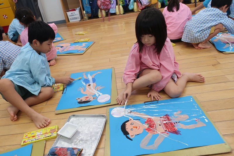 今日は、今月2回目の絵画教室がありました! 1回目の絵画教室で描いた自分の身体に、クレパスで髪の毛や水着を描き足していきました♪ 自分の髪の毛は長い?短い?女の子はくくってる?くくってない? 水着はどんな水着?柄はどうしよう? と自分に問いかけながら、頭の中のイメージを描けるように想像力を高めて描き進めていくらいおん組さんたちでした! 次にレーと爪楊枝を使って、穴をあけた銀色の折り紙をシャワーヘッドに見立てて、シャワーヘッドから水が流れている様子を表現しました! 使ったのは、歯ブラシと白色の絵の具! 歯ブラシのガサガサとした毛を利用して、かすれた絵の具で水の透明な部分を表現しましたよ(*´▽`*) 今回もとっても素敵な作品ができました!! |