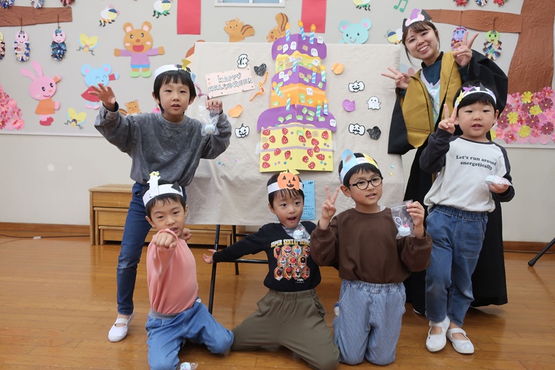 今日は10月31日!! ハロウィンということで、今日のらいおん組さんはそれぞれ好きなおばけに変身し、 ハロウィンパーティーをしました♬ 最初はそれぞれ冠を作るところから・・ ドラキュラだったり、黒猫だったり画用紙や色鉛筆を使いながら、 イメージしたものを頑張って作りました(*^-^*) ハロウィンをイメージしたもので、自由に好きな冠を作っていいよ~ というと、それぞれ工夫をしながら製作したり、 お友だち『こうしたら?』『どうやって作るか教えて~』と助け会いながら 製作する姿がほほえましかったです( *´艸`) 冠を作った後は、ハロウィンパーティーでちょっとしたゲームをしました! 先生が隠した番号が書いてある紙を見つける宝探しをして、 先生に持っていき『トリックオアトリート!!』というと、 お菓子ではないですが、ちょっとしたプレゼントが・・!! 子どもたちとっても喜んでくれて嬉しかったです(*^-^*) この前あったお誕生会でみんなで作ったハロウィンのケーキをバックに お写真をとってハロウィンパーティーはおしまいです! 園ではおばけは出ませんでしたが、お家では今日持ち帰った冠で子どもたちがおばけ役をしてくれるかもしれませんね( *´艸`) |