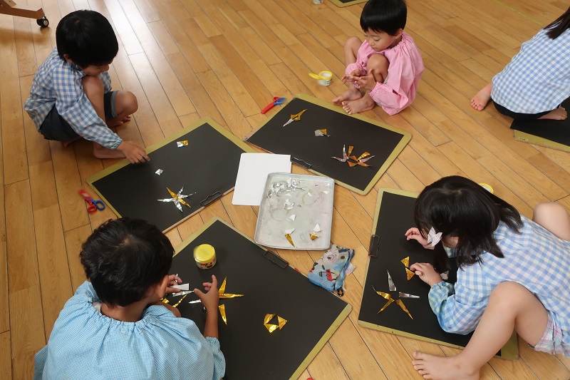 今日は、今月1回目の絵画教室がありました! 今月のテーマは「宇宙」です♪ はじめに、ハサミと金色と銀色の折り紙を使って、いろいろな大きさの3角形を作りました! チームで切った折り紙を共有しながら、黒い画用紙に、宇宙の星を描いていきます(*^▽^*) 「難しい~」「どんな形にしよう~?」と組み合わせを変えながら、試行錯誤して色々な形挑戦していましたよ! 次は、濡らした白画用紙に絵の具を垂らして、惑星を作りました♪ 色が混ざり合い、広がっていくのを楽しそうに観察しながら、製作していました! 次回の絵画は、この続きから・・どんな宇宙ができるのか楽しみだね♪ |