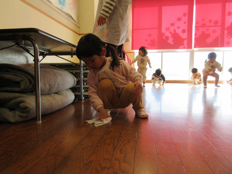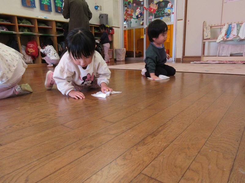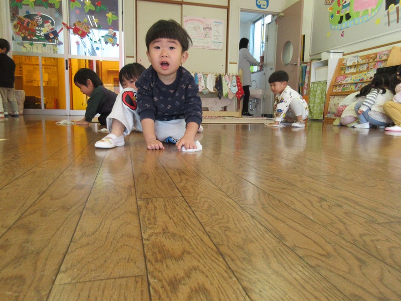 もうすぐ今年も終わりますね。 今日は気持ち良く新年を迎えられるように、ぱんだ組さんみんなでお掃除をしました! ウェットティッシュを持って、自分のロッカーや床を磨きましたよ。 雑巾がけレースをしたり、汚れているところを入念に磨いたりと、みんな楽しそうでした♪ 黒くなったウェットティッシュを見て、「こんなに汚れとったん!」とびっくりしていた子どもたちでした( ゚Д゚) ぱんだ組さんのおかげできれいなお部屋で保育を始められそうです!! 来年もよろしくお願いいたします(^^)/ |