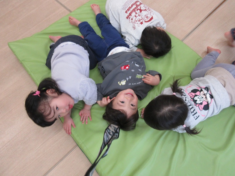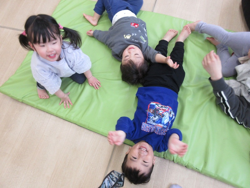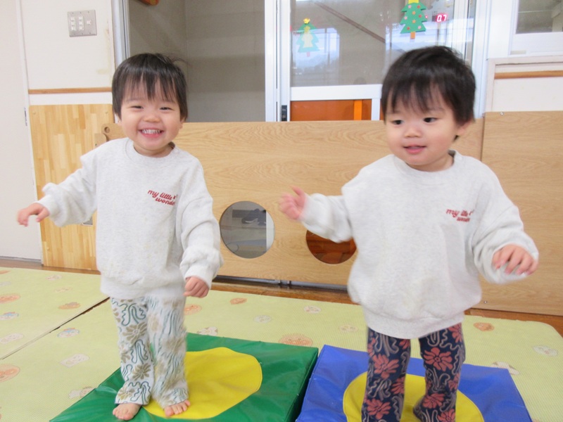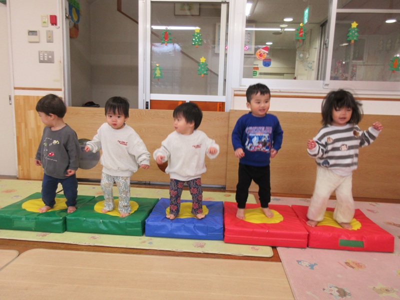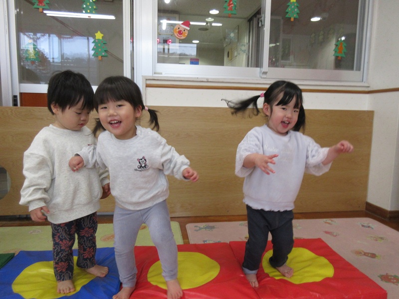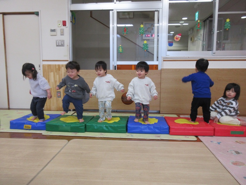 今日は、クリスマス♡昨日はこども園にサンタさんがきて驚きと嬉しいがいりまざっているようでした。一人ずつにプレゼントをもらってステキなクリスマス会でした。 お部屋で「ジャンピングマット」を使って、身体をたっぷりと動かして遊びました! マットをみると「何これ!?」「なにするの~?」と興味津々なこどもたち。マットを一つずつ置いていくと、座り込んでみたり、「ジャンプ、ジャンプ」といいながらとんでみたりしていました。 友だちと並んで「ああーー!!」と声をのばしながら足踏みをしていることもありました(笑) 寝込んで「ねんね~」とひと休憩することもありました。数人が寝ころんでいると真似をして友だちもやってきて一緒に寝ころんでいました( *´艸`) |