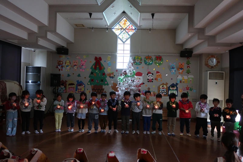 今日は、12月の誕生日会とクリスマス会をする予定でしたが、 感染症の事を考慮して誕生児のみ写真を撮りに遊戯室へ行き、各クラスで担当の先生の出し物を見ることになりました(^^♪ 今回は、誕生日のお友達は少なかったですが、その分気持ちをたっぷり込めてたんたんたんじょうびの歌と写真を撮りましたよ☆ クリスマス会の出し物では、先生のパネルシアターをとても楽しそうに見ていました♬ 内容もクリスマスだったので、どのクラスのお友達も興味津々でしたよ! 出し物の後は、みんなで季節の歌を一つ歌いました。 楽しく歌を歌い終わると・・・ “シャン ♪ シャン ♪ シャン ♪ ”と鈴の音が!! すると…サンタクロースがやってきてくれました!! 歌の通り真っ白おひげのおじいさんのサンタさん♪ みんな目をまん丸にして、キラキラさせてサンタさんに挨拶をしてくれました♪ 1人ひとりサンタさんからプレゼントをもらいとてもうれしそうでした♡ 最後はサンタさんと記念写真をとって、「またね~」と挨拶をしました♪ また来年も来てくれるのが待ち遠しいみんなですね☆ サンタさんが帰った後は、毎年恒例のキャンドルサービスをらいおんさんがしました! 小さなグラスに入ったロウソクを消えないように大切に持ち、 首元にはレイをかけて、きれいな声で気持ちを込めて『きよしこの夜を』を歌いました。 たじりこども園のみんなの思いを込めて、また来年も素敵なクリスマスになりますように♡ |
