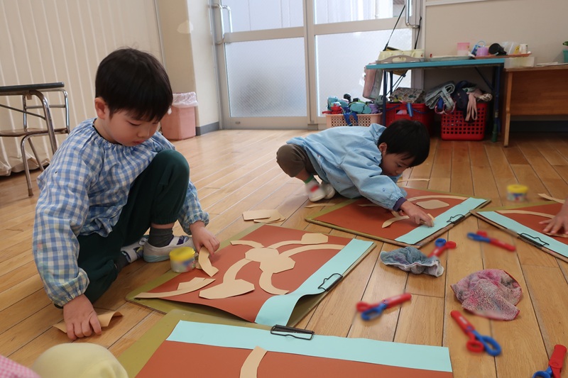 ☆今日の更新は、昨日の絵画教室も一緒にお伝えしますね! ・絵画教室・ 新年になり1回目の絵画教室☆講師の先生に新年のご挨拶をしっかりとして 楽しい絵画教室がスタートしましたよ(^^♪ 今回は、『ありの巣』を作りました! まず、“ありの巣”はどこにあるのか?どんな巣なのか?を実際の写真を見ながら 自分たちが作るならどんな巣にするのかを想像しました。 それから波文と四角が描いてある紙を線の通りに切って、ありの巣の 道と部屋を作りました。 ありの巣は、地面の中なので水色の紙を上側に貼って地上を作ってから 自分が想像するありの巣を作っていきました! 「こんなのかな?」「え~これどこに貼ろう?」と考えながら貼っていったらいおんさんです☆ 次回は、作ったありの巣にありさんを描いていきますよ!! どんなありの巣になるのかお楽しみに( *´艸`) ・サッカー・ コーチに会う前に「なんて挨拶する?」と聞くと・・・ 『新年あけましておめでとうございます!今年もよろしくお願いします!』と しっかり挨拶の練習ができたみんな☆ ちゃんとコーチに挨拶が出来て若干のドヤ顔が見られました( *´艸`) 新年1回目のサッカーも鬼ごっこからスタートしましたよ! 今日は、ボールを持っての鬼ごっこ♪タッチされたらボールを持って追いかけます☆ 「あ~タッチされた!」など楽しそうに走り回っていましたよ♪ 今回新たに、“相手チームのコーンに隠されたボールを見つけて、自分のチームのコーンに隠す”というゲームをしました☆ 隠してもすぐに見つかるので、おおはしゃぎでボールを見つけようとするみんな♪ 結果発表の時間には、どこに隠していたか覚えていないので 1個ずつコーンの確認をするたびに「ない!」「あ!あった!」と大興奮でしたよ! 久しぶりの試合も途中涙も出ていましたが、試合であると割り切って元気に試合をしました! 寒さも吹き飛ぶくらい思いっきり楽しんだらいおん組さんでした♪ |