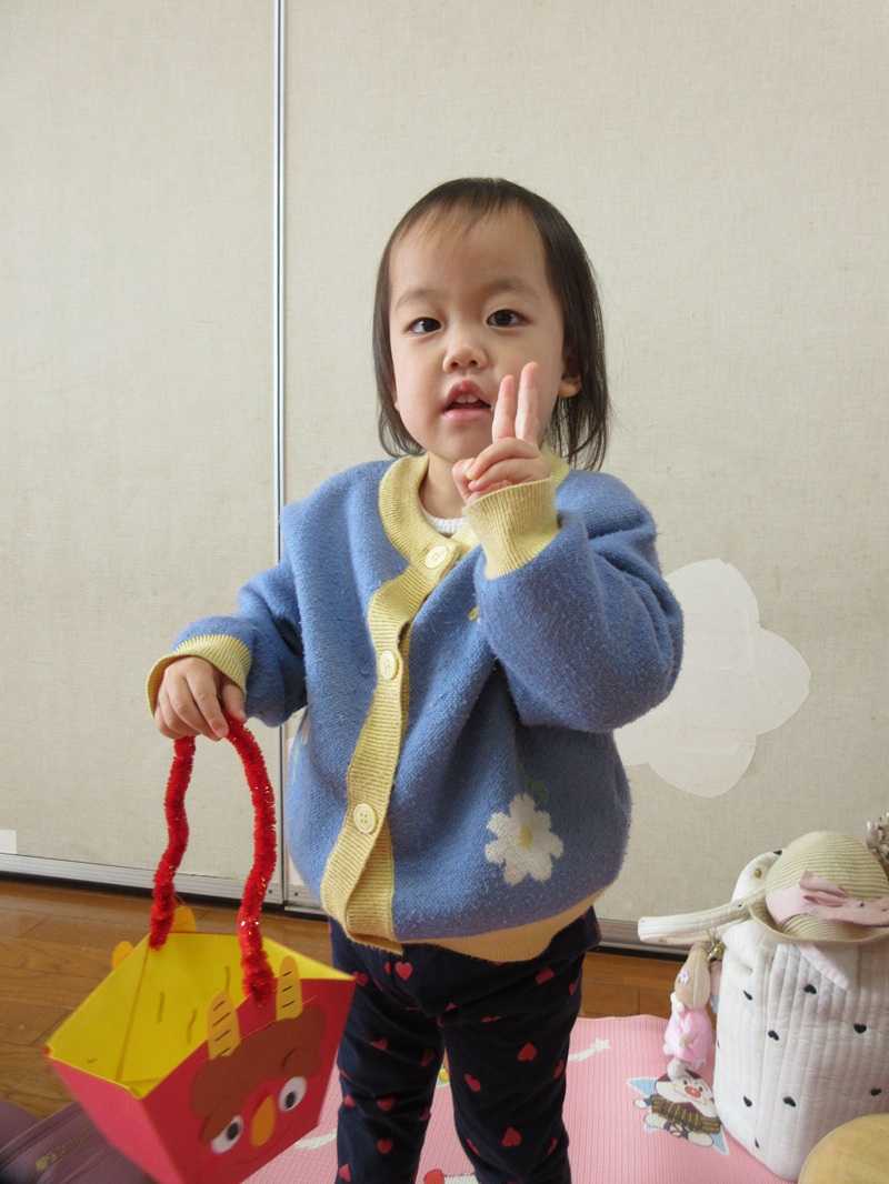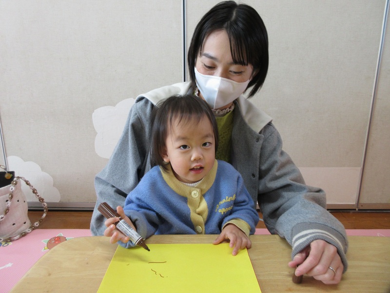今日は、2月の節分に向けての製作をしましたよ!! 豆まきと言えば・・・お面!! そこで、お面を三角帽子型に変更し、可愛い鬼さん帽子を作りました!! まずは、鬼さんの手の部分である手型を取りました! 顔と同じ色にしようと思いましたが、「これがいい!」と子どもたちからのリクエストがあり、 可愛いピンクで手型を取りましたよ♪ 手型が苦手なお友だちは手の形にペンでなぞって指スタンプで色付けしました☆ 鬼のパンツでお馴染みのトラの模様は、黒い画用紙をビリビリと破ってのりで貼りました! 最後は、帽子の形にして花紙を丸めてきれいな髪の毛をつけてあげました! みんなとっても素敵でかわいい鬼さんができました♪ この鬼さん帽子なら悪い鬼さんもニッコリしてしまいますね( *´艸`) 次回は、2月20日(木)『ベビー&キッズマッサージ』です! ご予約お待ちしております♪ |