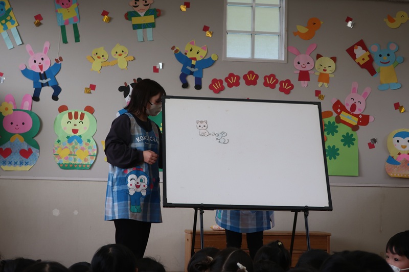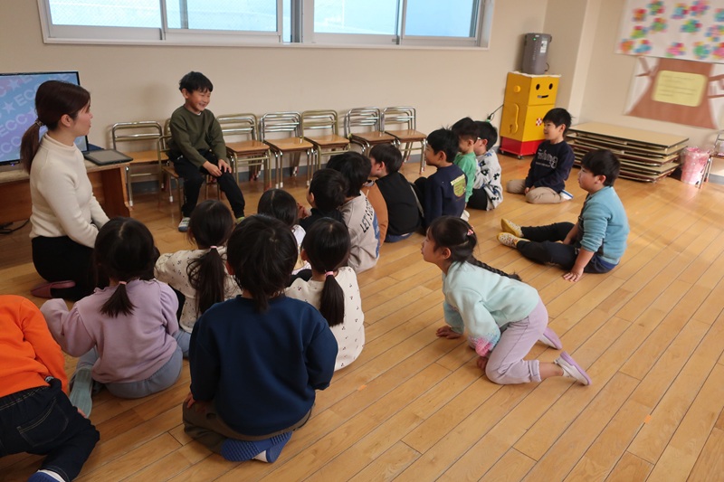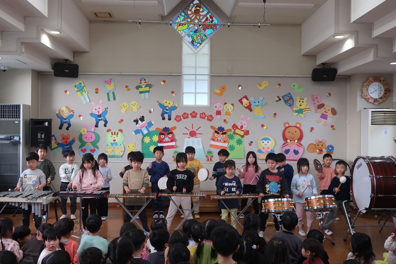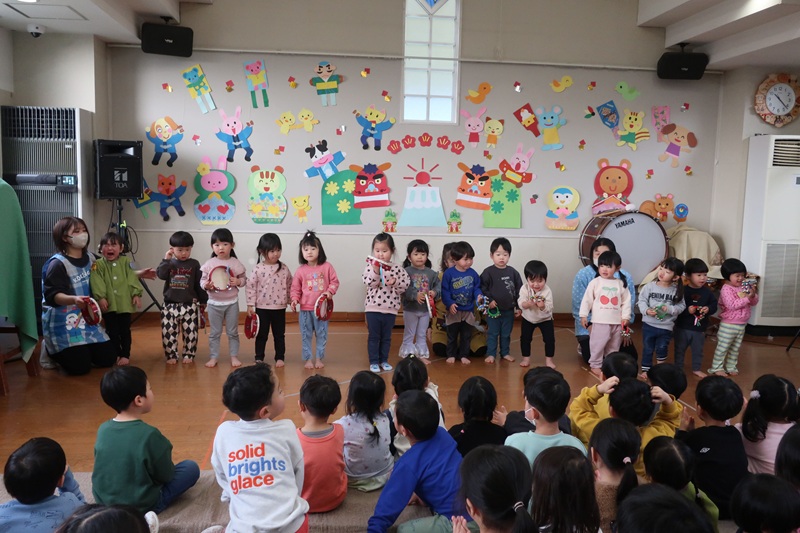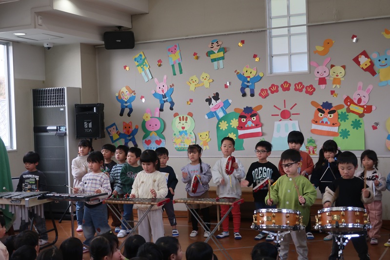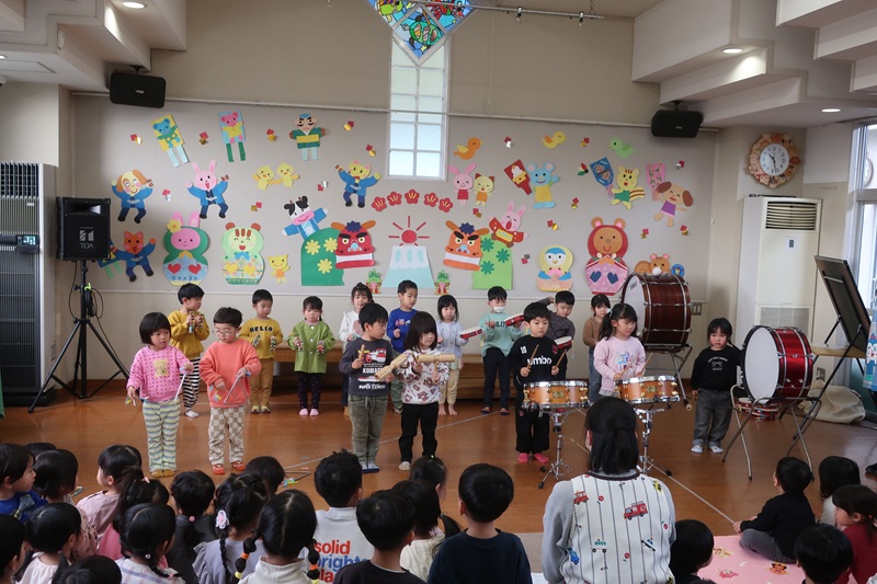 1月生まれのお友だちのお誕生日会でした♪ 大きいクラスのお友だちには 名前・年齢・大きくなったらなりたいもの 小さいクラスのお友だちには 名前・年齢・好きな食べ物を聞きました! 先生からの出し物は「十二支のおはなし」のパネルシアターでした。 どのようにして干支が決まったのかというお話でしたよ! 発表会直前ということで発表会頑張ろう会も行いました! ぱんだ組、ぞう組、きりん組、らいおん組の合奏を順番に前に出て演奏してもらいました! どんな楽器を使っているのか紹介をして、らいおん組さんにはどうしてこの楽器を選んだのか、練習はどうだったかをインタビューしました! 今週の金曜日は発表会ですね!みんなで頑張りましょう! |