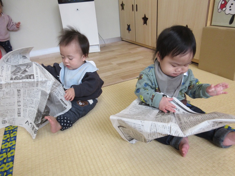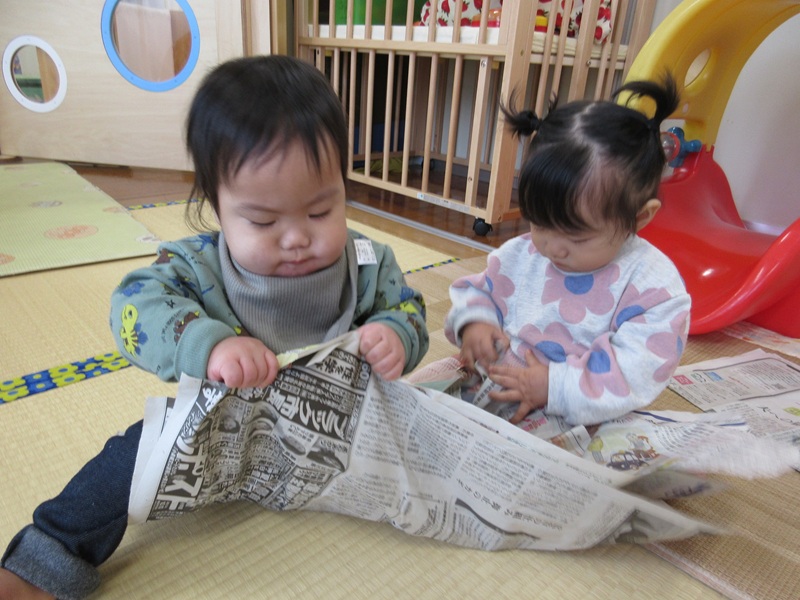 1月スタート!今月は初めての発表会がありますね。寒さがぐんと厳しくなり、連休中は雪が降り、初めて触ってみたりしてお友だちもいました♪体調管理にはきをつけて楽しく過ごしていきたいと思います。 今日は、お部屋で新聞紙遊びをしました。 一枚分の大きさに興味津々なこどもたちでした。どうやってもってみようかまわりの様子を伺ってみることもありました。先生が握ってふってみると真似をして上下に振ってみていました。 ちぎってみる時は真剣な表情で集中モード!指先が少しずつ器用になり自分で黙々とちぎってみたり、切り込みを持って引っ張るようにしてちぎりました。 新聞紙を雑巾にみたてて新聞紙がけをすることもありました。畳みもピカピカになっているようにみえます( *´艸`) |