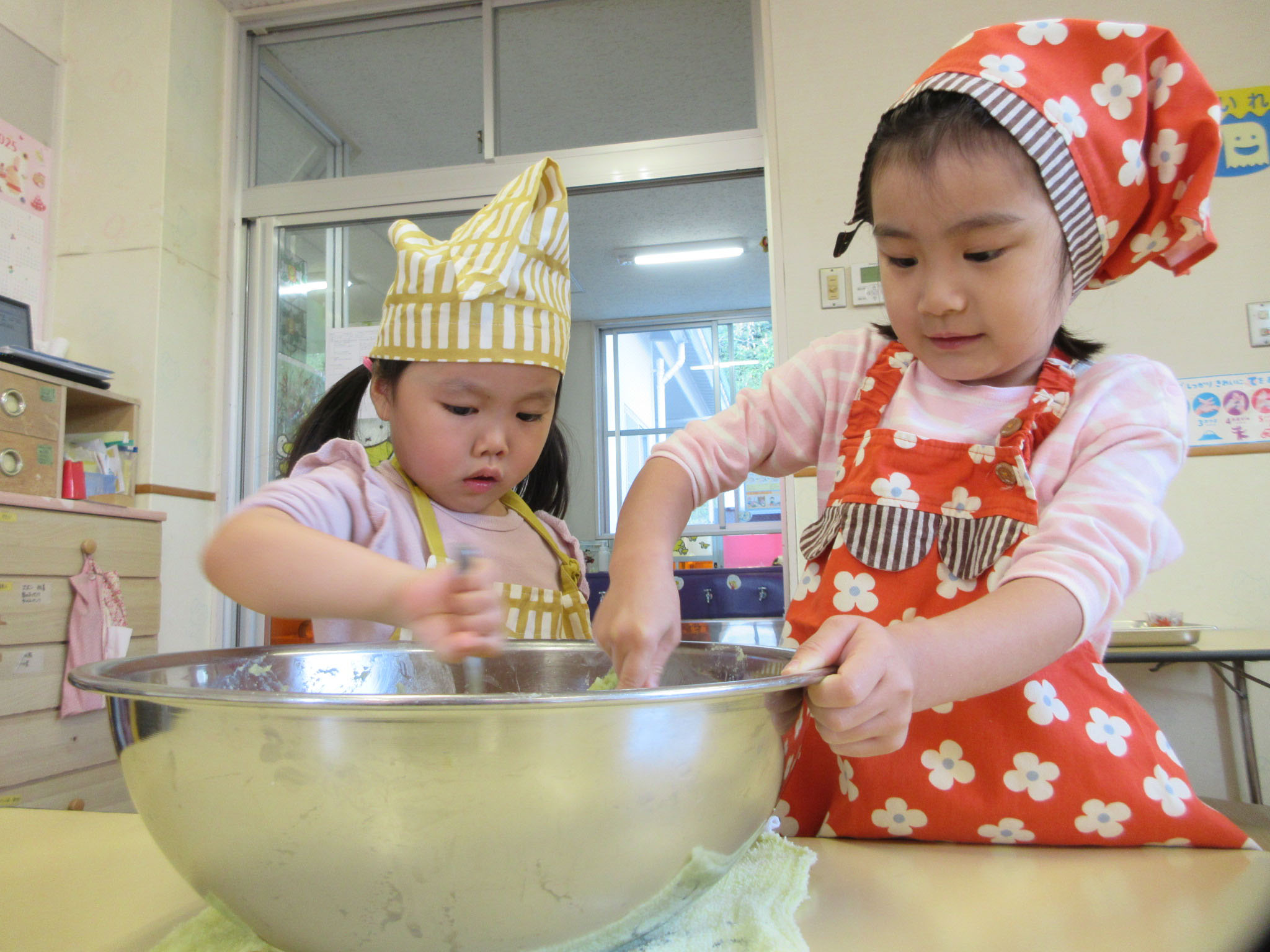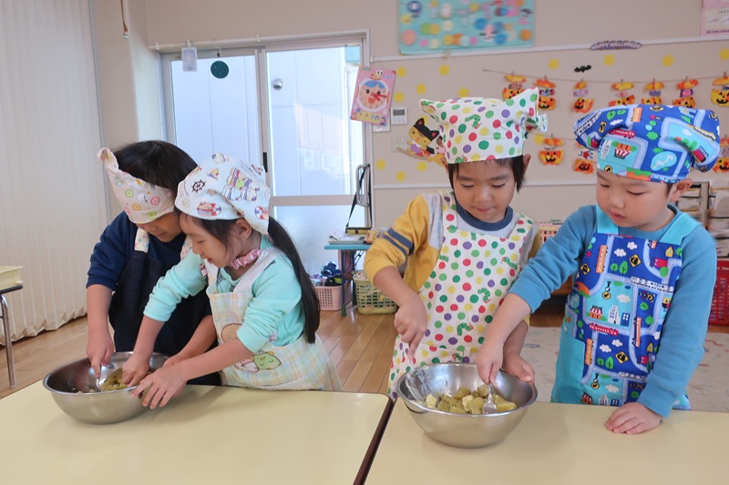 今日は子どもたちが楽しみにしていたクッキングがありました!! 今回クッキングで作ったのは「スイートポテト」です。 材料のさつまいもは先日らいおん組・きりん組が掘った さつまいもを使用しましたよ!! 【スイートポテトの材料】一人分 ・さつまいも・・・50グラム ・砂糖・・・5グラム ・牛乳・・・7.8グラム ・バター…2.5グラム 【スイートポテトの作り方】 ①さつまいもの皮をむいて茹でる。 ②茹でたさつまいもにバター、砂糖、牛乳を入れさつまいもを つぶしながら混ぜる。 ③混ぜ合わせたものをお弁当カップに入れ、オーブンで10分程 焼く。 ④完成♫ ぞう組さんは・・・ きりん組さんとらいおん組さんが掘った さつまいもを使ったクッキング(^^♪ さつまいもをつぶしてると、形が変わっていったり、 美味しそうな匂いがしてきたり、 その中で「小さくなってきたね」「いい匂い~」と 会話を楽しみながらクッキングしました! 自分たちが作ったのでいつもより特別なおやつに、 喜びながら、美味しくいただきました(#^.^#) きりん組さんは・・・ おいもほりでみんなが収穫した らいおん組さんは・・・ きりん組さんと一緒に掘ったさつまいもを使っての クッキング♬ 昨日からとーっても楽しみにしていました(*´▽`*) 給食室でふかしてもらったさつまいもに 牛乳、バター、砂糖を入れてみんなでまぜまぜ~♪ バターを見せるとチーズ?と不思議そうならいおん組さん よく知っているお友だちにバターだよ! と教えてもらいました( *´艸`) みんなで協力して混ぜて、名前の付いた旗を差したら完成~!! 自分たちで作ったおやつは いつも以上にパクパク食べすぐになくなってしまう らいおん組さんでした! 出来上がったスイートポテトは、15時のおやつで美味しくいただき ましたよ(#^.^#) 自分で作ったスイートポテト、「おいしい~!!」と言いながら あっという間に完食でした♪ |