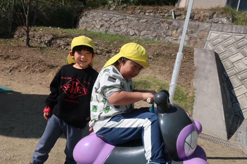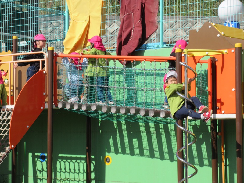 今日は、公園を目指してお散歩をしました(^^♪ ぞう組になって初めてのお散歩で、 朝からみんなワクワクしている様子でした! 公園までの道には、イチジクやザクロ、金木犀、紅葉している葉っぱ など秋を見つけながら、歩きました! 「飛行機雲だっ!」「あ、パトカー」と 公園に着く前でも楽しそうな様子でしたよ。 公園に着いてからは、園とは違う遊具もあり、 お友だちと順番を守りながら、過ごしました! 遊具だけでなく、木の実を見つけたり、砂にお絵描きをしたりして お友だちと楽しく過ごしました(*^_^*) 帰り道は、疲れ+上り坂と言うこともあり、 行きに比べてペースダウンしましたが、 給食を励みに頑張って歩きました!! |