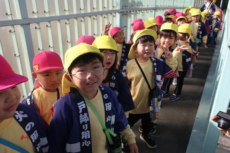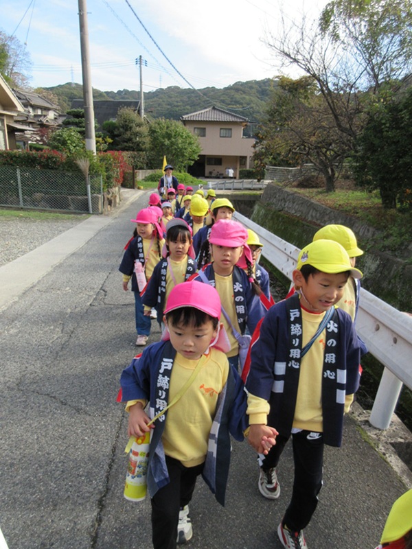 今日は、きりん組さん、らいおん組さんで防火の呼びかけに行きました(*^^*) 『戸締り用心 火の用心♬』 『月に一度は大掃除 元気元気な月曜日』 『火には用心火の用心 肝心かなめの火曜日だ』 『水は命のお母さん すいすいすいすい水曜日』 『木や草花は友だちだ もっともっと増やそう木曜日』 『お金は世のため人のため ちょくちょく貯金だ金曜日』 『どろんこ土のこ元気な子 どんどん出てこい土曜日だ』 『一日一回良いことを ニコニコニッコリ日曜日』 と防火の歌を歌い、防火の誓いを宣言しながら田尻町をまわりましたよ(^^♪ 見に来て下さった地域の方に挨拶をしたり、周りの木や草花を観察しながら楽しんであんず広場まで歩き、トイレ休憩、写真を撮った後は、少しだけ広場で遊んでから園に帰りました(*^^*) 大きなケガもなく、安全に帰ってくることができ、最後はきりん組さん、らいおん組さん一緒に行ってくれたお友だちにお互いお礼を言いました! 声を出し、たくさん歩いて、お腹はペコペコ~ パクパク食べ、お昼寝ではグッスリの子どもたちでした♡ |