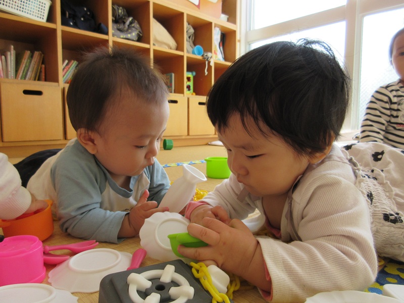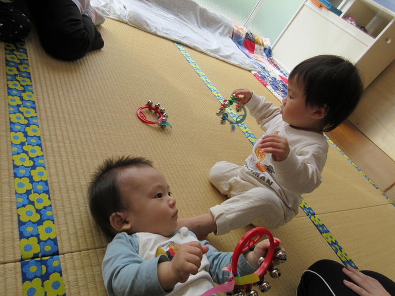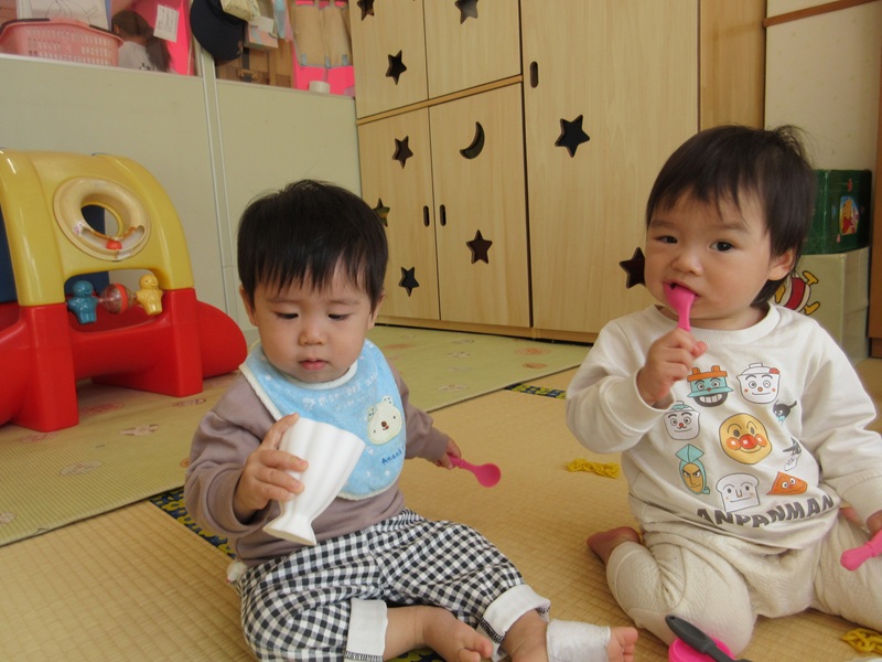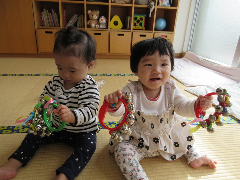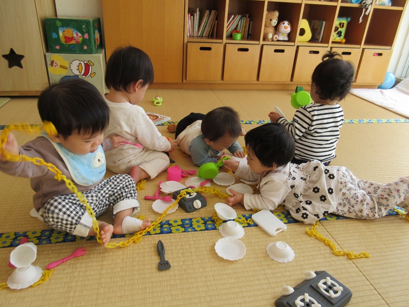 今日はみんな好きな「おままごと」で遊びました。お皿やスプーンはシリコン素材になっていて、感触もお気に入り♡ 振ってみてスプーンやフォークが曲がる動きが面白かったり、口に加えて噛んでみたりしていました。 チェーンも加えてみるとお皿の中に出し入れしてポットン落としのようにしていました。長くつなげてみると立ち上がって長さに驚いていることもありました。 鈴で楽器遊びもしました。音がすると急いで近くまできてくれたひよこ組さん。両手持ちや片手で持って振り方もダイナミックにしたり、高く上げて先生にみてとアピールしながらしたりしていました。そっと近づいて慎重にしてみることもありました。 |