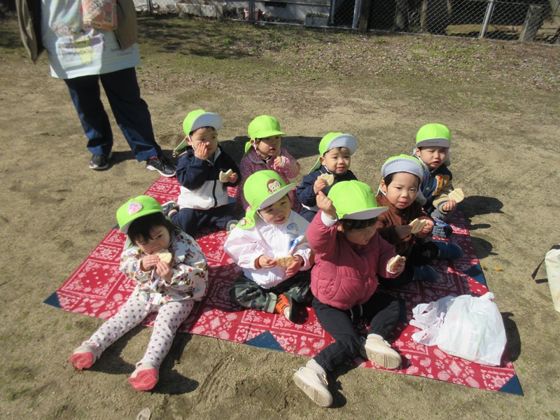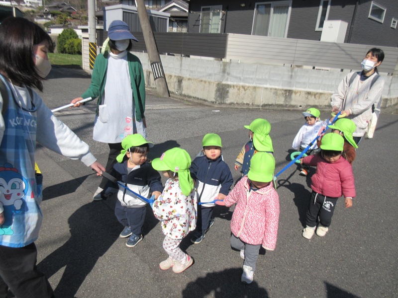 今日は気温も高くポカポカ陽気でお散歩日和✨ 楽しみにしていた、おもいで散歩に行ってきましたよ! 今年度のりすぐみさんにとっては一番長い距離のお散歩です! リングひもを持って「レッツゴー!」 杏の木にお花が咲いていたり、スイセンのお花を見つけたりと、 春を沢山感じながら歩きました❁ ショベルカーに清掃車、ダンプカーにバス…など、 大好きなはたらく車にもたくさん会えましたよ(*´▽`*) 公園についたらレジャーシートに座っておやつタイム♩ 外でいただくおやつの美味しい事♡ 口の周りにたくさんつけておいしそうに頬張っていました( *´艸`) ひと休みした後は、アンパンマンしっぽ取りをしてあそびましたよ。 しっぽにみんなが大好きなアンパンマンがついているので、 「まてまてー!」とGETしようとたくさん走った子どもたちです! 帰り道はちょっぴりお疲れモードでしたが、 最後まで頑張って歩いて帰ってきてくれました。 出発から1時間半の長旅でしたが、たくさん歩けるようになった子どもたちの成長を感じましたよ♡ |