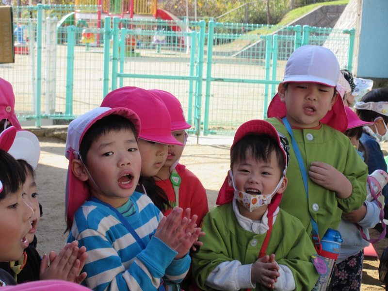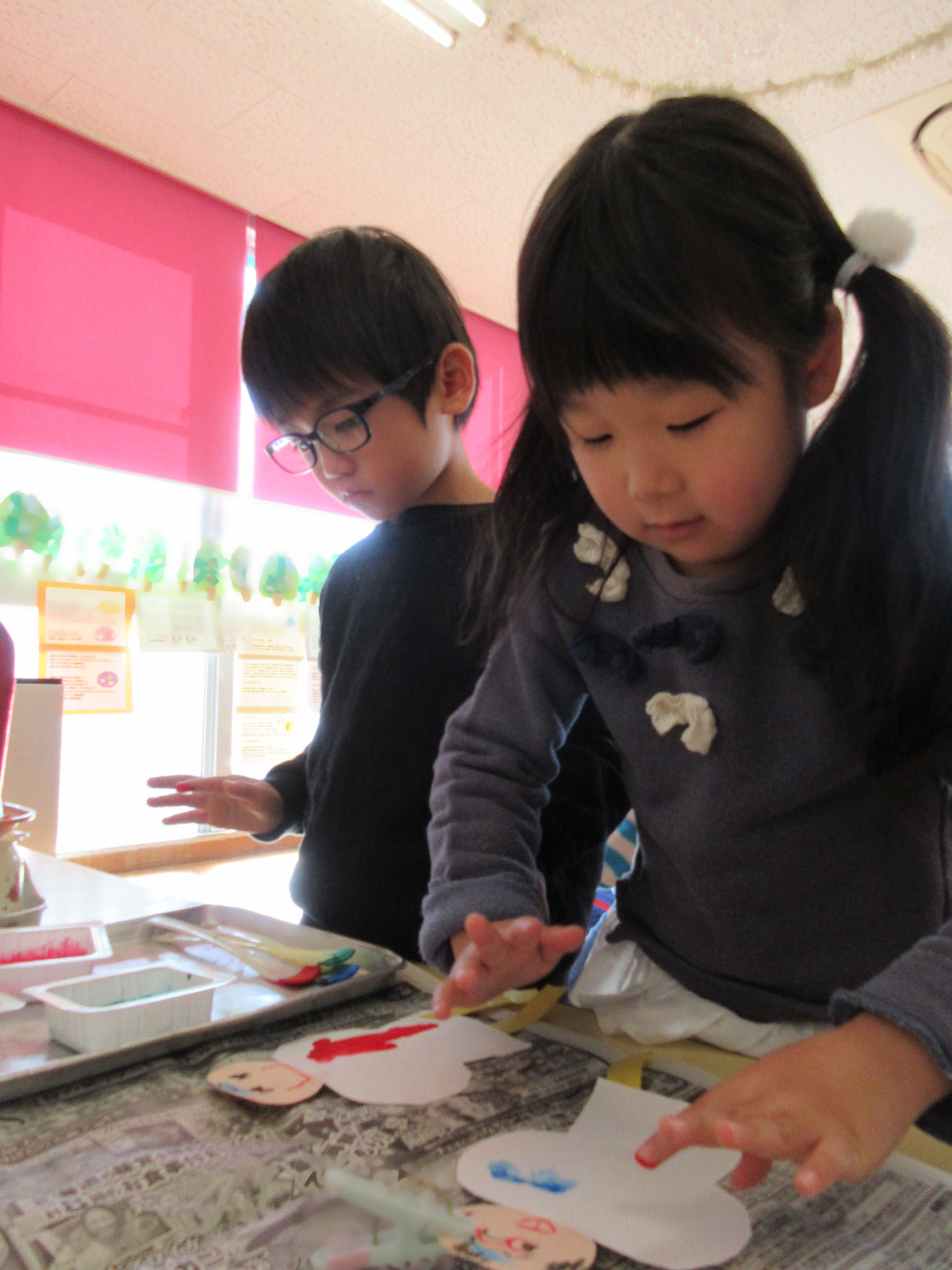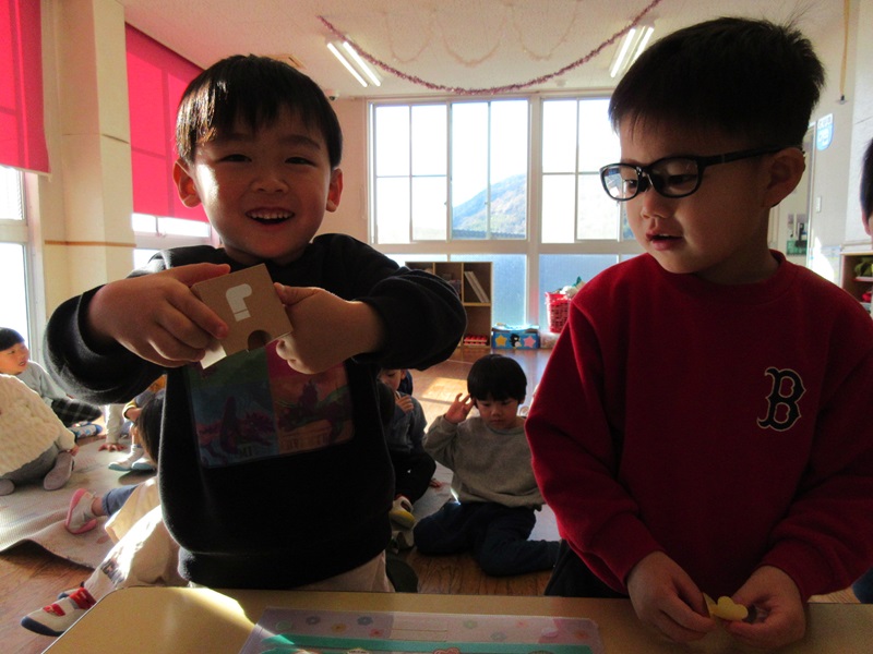 はやいものであと2ヶ月できりん組さんが終わりますね。 発表会では大成長した姿を見てもらえたかと思います!最近のきりん組さんは来週の節分が楽しみで仕方がないようです(*^▽^*) 「鬼何人くるんかな~?」「あの山から下りてくるんだって~!」と大はしゃぎですよ! そんな節分に向けて鬼のお面を作りました!はさみを上手に使えるようになってきたので鬼の顔のパーツはすべて子どもたちに切ってもらいました!丸や直線だけでなく、少し複雑な形も難なく切っていました☆作ったお面をかぶって鬼退治をするのが楽しみですね! 月曜日は英語のレッスンもありました!少しづつ分かる単語が増えてきて英語のレッスンが楽しいようです!身体を動かすことが好きなのでお友だちとペアになってふれあい遊びをする時が1番楽しそうですよ♪ 外遊びでは鉄棒や渡り棒に興味を持っています!「らいおん組さんになったら前回りと逆上がりせんといけんけ~練習しとこ~!」と練習を始めていました!逆上がりは身体を引き付けることが難しいようなので、タオルで背中を支えて身体を持ち上げる練習をしています!「できた~!」と嬉しそうでした♡ |