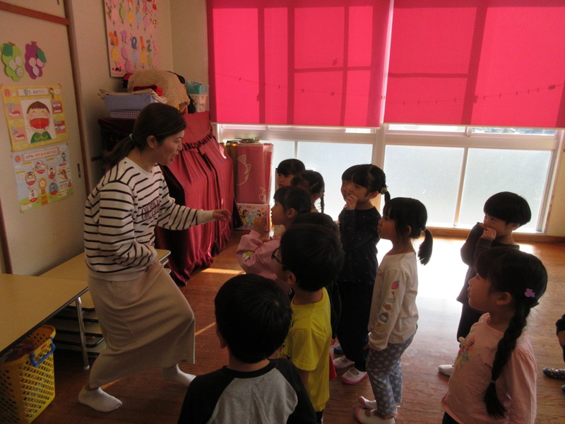 11月ももう終わりに近づき、あと1ヶ月で今年が終わりますね。最近はすっかり冬らしい気候となり、赤く染まった落ち葉がたくさん落ちているのを見かけます。 今日はきりん組さんの保育参観日でしたね!今回は朝の会、ミニゲーム、英語のレッスンの様子を見てもらいました。春の参観日よりも落ち着いて参加する姿を見てもらえたかと思います。 朝の会ではお当番さんに今日の日付、曜日を答えてもらっています!今日は何日かな?何曜日かな?と意識して過ごしています!きりん組さんの得意の歌も聞いてもらいました!大きな声でうたえていましたね(^^)/ ミニゲームでは動きながら先生の声も聞かないといけないのでとっても集中していました!2つの動きを一緒にすることは難しい事ですが、ゲームを通して楽しんで練習していっています!もしも声が聞こえていなかった!という場合でもお友だちが何個取ったか見て、自分も取り、周りを見て行動するという姿も見られましたね☆ 英語のレッスンではまずは英語であいさつ!goodmorning!と元気よく挨拶ができていました!保護者の方のところに行って「My name is ○○!I'm four years old」と自己紹介をしました!恥ずかしがっている子もいましたが、どうでしたか?お父さんやお母さんとのふれあい遊びもとても楽しそうでしたね( *´艸`) 本日は参観日にお越しいただきありがとうございました! |