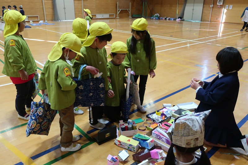 ティッシュペーパーの箱で作られた可愛いかばんやトイレットペーパーのカッコイイ鉄砲、面白いゲームに『どっちに行こう~』『あそこいこーよ!』とワクワクが止まらないらいおん組さん!