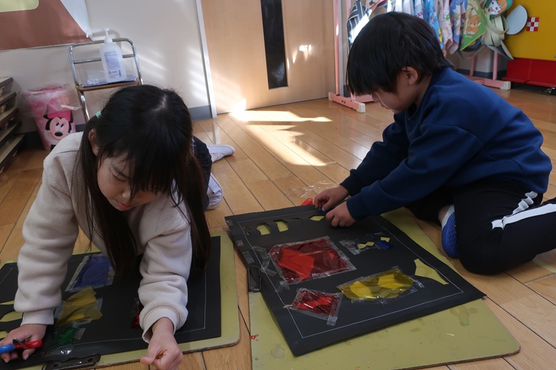 今日は、前回くり抜いたものにセロファンテープとカラーセロハンを使ってステンドグラス風に仕上げました!
